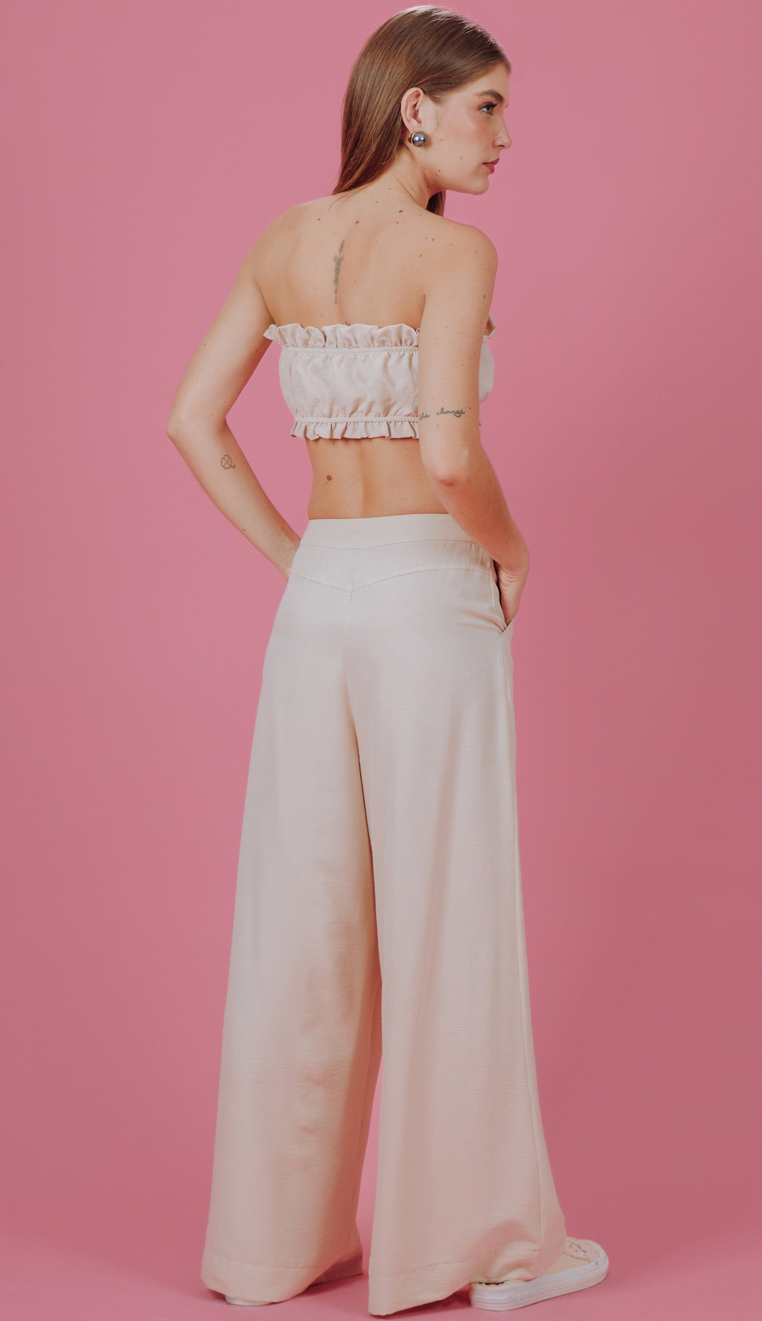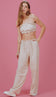 Conjunto confeccionado em poliéster com aspecto de liocel e efeito amassadinho. O top faixa não possui mangas e conta com elástico interno franzido no decote e na barra, para dar sustentação à peça, seguido de babadinhos. A calça wide possui fechamento frontal por zíper invisível, elásticos internos com reguladores para ajuste na frente, bolsos laterais e riscas frontais. Esse tecido garante praticidade e elegância, pois, devido à sua composição, não amassa facilmente e o aspecto de 'tecido nobre' dá um ar sofisticado ao look.