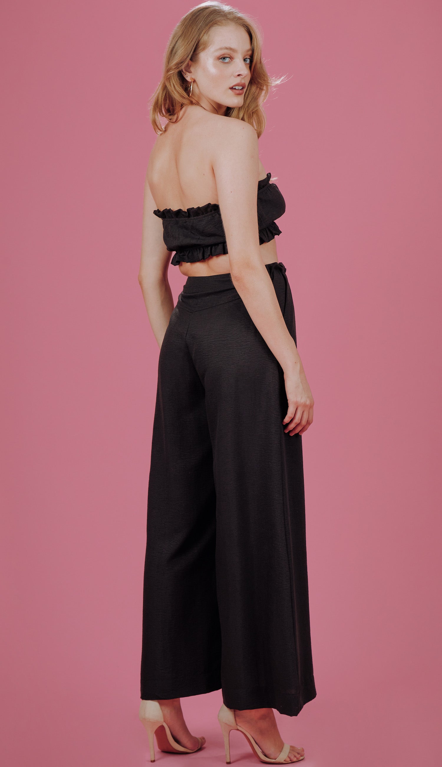 Conjunto confeccionado em poliéster com aspecto de liocel e efeito amassadinho. O top faixa não possui mangas e conta com elástico interno franzido no decote e na barra, para dar sustentação à peça, seguido de babadinhos. A calça wide possui fechamento frontal por zíper invisível, elásticos internos com reguladores para ajuste na frente, bolsos laterais e riscas frontais. Esse tecido garante praticidade e elegância, pois, devido à sua composição, não amassa facilmente e o aspecto de 'tecido nobre' dá um ar sofisticado ao look.
