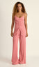Conjunto confeccionado em malha com nervuras texturizadas, estilo "crochê". A blusa possui modelagem alongada e ajustada, decote em V, alcinhas reguláveis, fechamento frontal por botões madrepérola e detalhe franzidinho no centro que desenha a silhueta e deixa a peça bem acinturada. A calça possui forro, é no estilo wide e conta com elástico interno no cós da cintura e bolsos laterais.