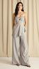 Conjunto confeccionado em alfaiataria acetinada com aspecto levemente amassadinho. A blusa é alongada e não tem mangas; possui decote coração com nó transpassado no busto criando franzidinhos, silicone elástico interno para maior segurança, pala com recortes na cintura, recorte vazado abaixo do busto deixando toda a região da cintura à mostra, seguida de babado assimétrico, lastex nas costas do busto e elástico franzido na parte traseira do babado, garantindo o ajuste perfeito da peça ao corpo. A calça é pantalona e possui pala no cós, bolsos faca laterais e fechamento lateral por zíper invisível.
