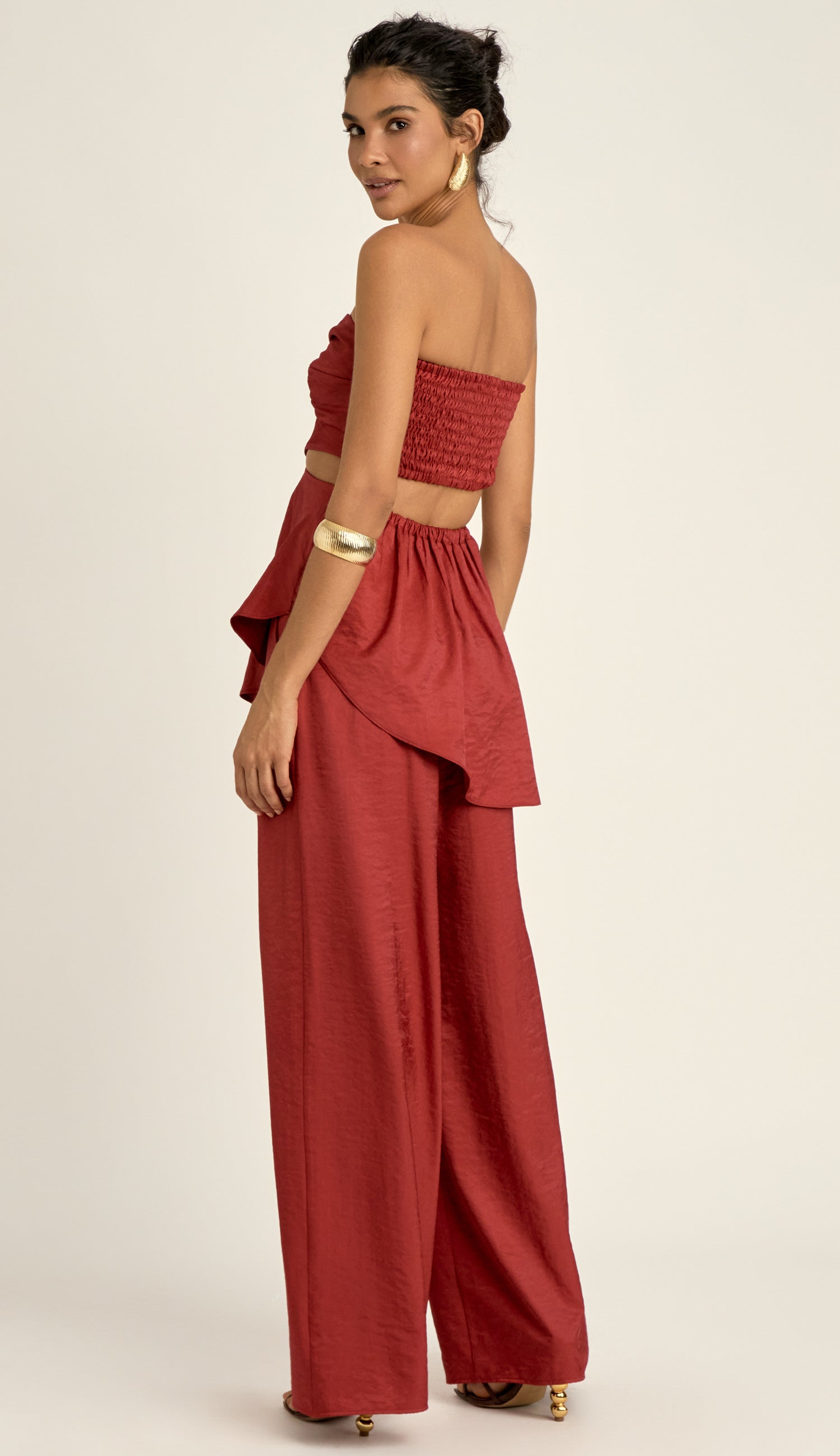 Conjunto confeccionado em alfaiataria acetinada com aspecto levemente amassadinho. A blusa é alongada e não tem mangas; possui decote coração com nó transpassado no busto criando franzidinhos, silicone elástico interno para maior segurança, pala com recortes na cintura, recorte vazado abaixo do busto deixando toda a região da cintura à mostra, seguida de babado assimétrico, lastex nas costas do busto e elástico franzido na parte traseira do babado, garantindo o ajuste perfeito da peça ao corpo. A calça é pantalona e possui pala no cós, bolsos faca laterais e fechamento lateral por zíper invisível.