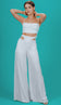 Conjunto confeccionado em viscose twill. O top possui decote reto, alcinhas reguláveis, recortes que modelam o busto e lastex nas costas para melhor ajuste ao corpo. A calça é pantalona e possui forro, cós mais largo com recortes vazados laterais, fechamento traseiro por zíper de metal com pingente com delicado detalhe da conchinha da Laguna gravado no metal e detalhes frontais de recortes na lateral com cordão forrado embutido em arco solto no cós para amarrar na cintura.