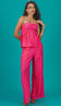 Conjunto com forro, confeccionado em poliviscose texturizado com aspecto de linho. A blusa não possui mangas, conta com silicone elástico interno no decote, que é reto; possui recortes no busto, franzidinhos logo abaixo dele, com tecido soltinho e lastex franzido nas costas para melhor ajuste ao corpo. A calça é pantalona e possui pala no cós, que é largo; bolsos laterais e fechamento lateral por zíper invisível.
