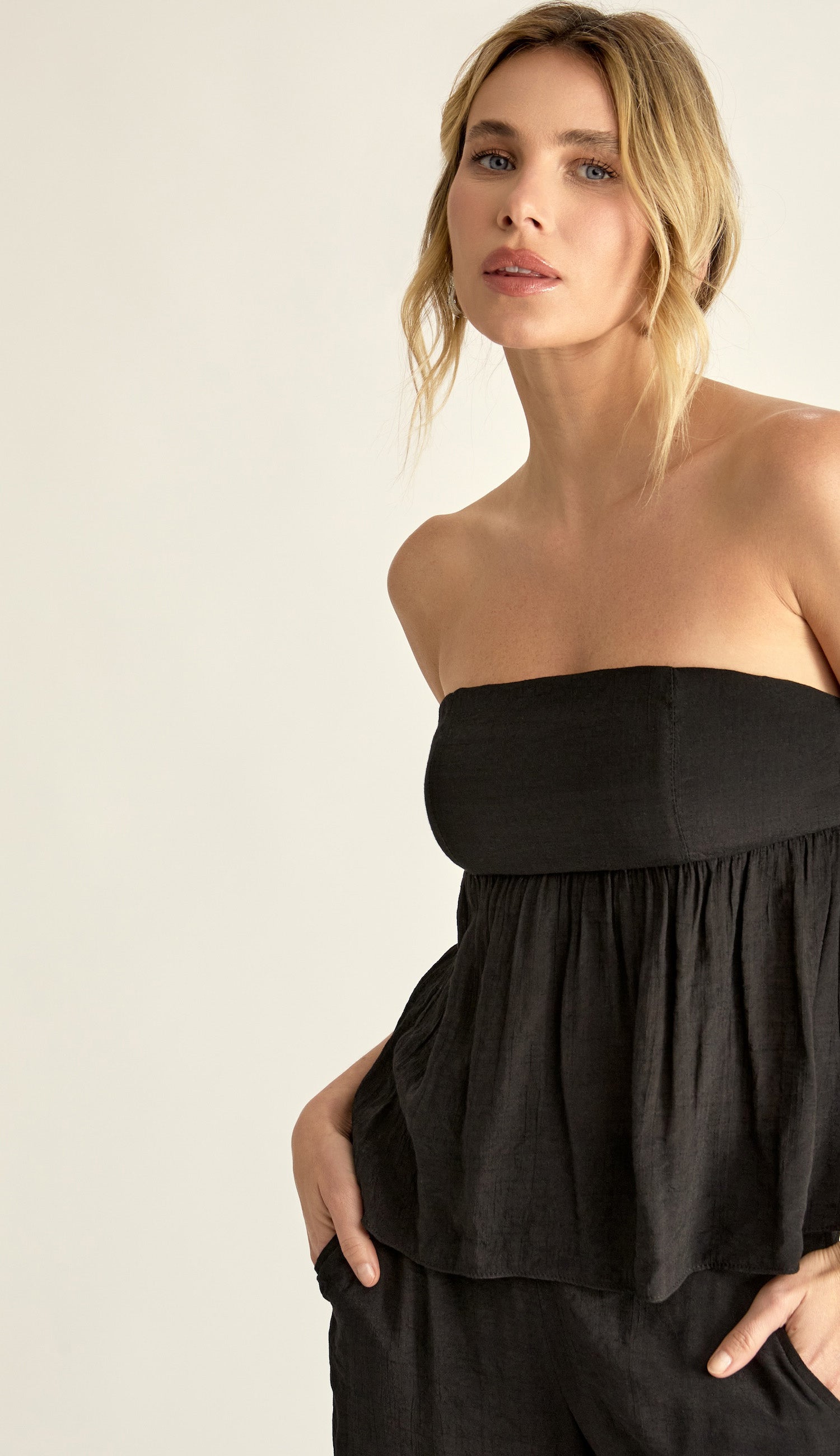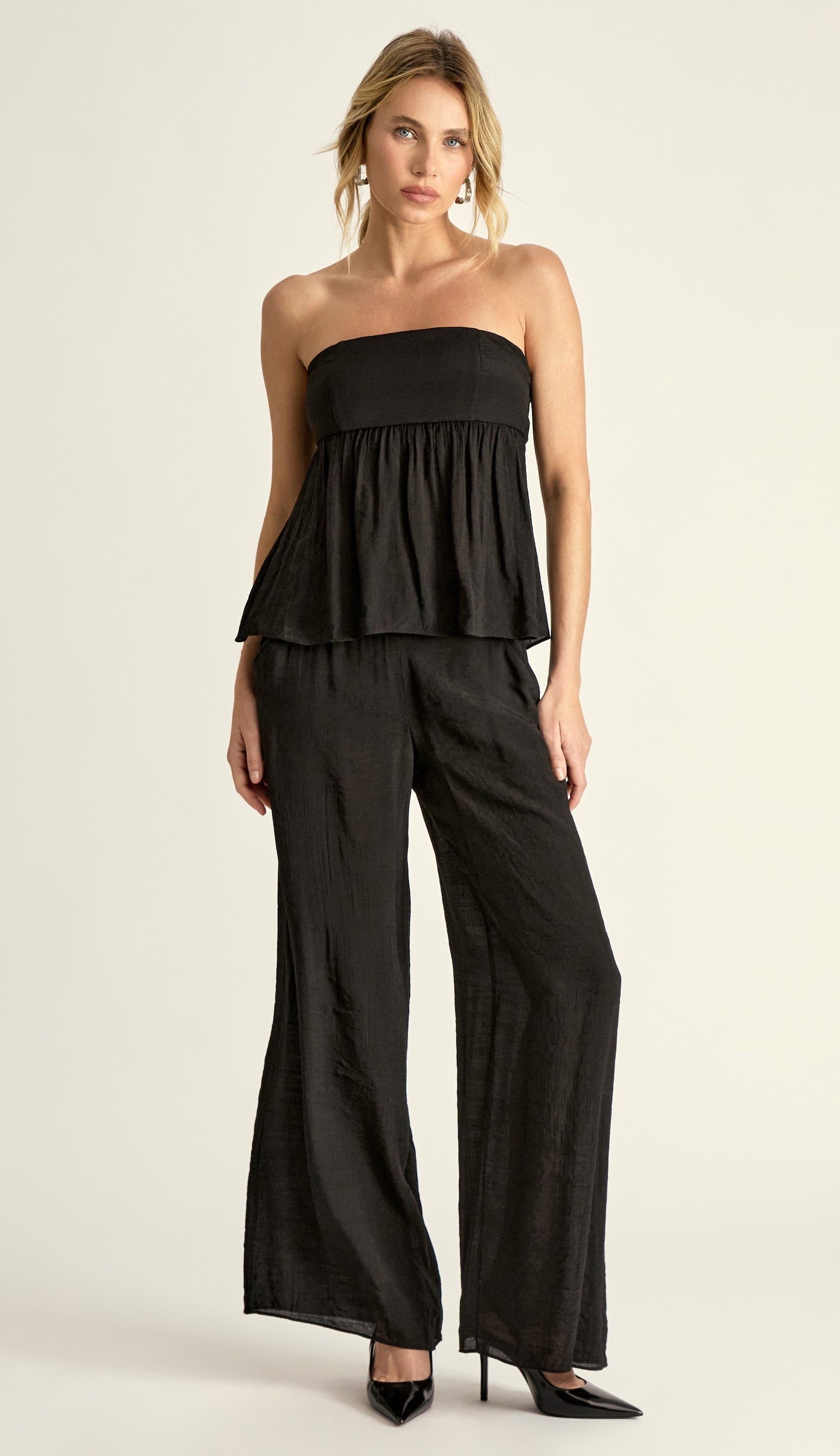 Conjunto com forro, confeccionado em poliviscose texturizado com aspecto de linho. A blusa não possui mangas, conta com silicone elástico interno no decote, que é reto; possui recortes no busto, franzidinhos logo abaixo dele, com tecido soltinho e lastex franzido nas costas para melhor ajuste ao corpo. A calça é pantalona e possui pala no cós, que é largo; bolsos laterais e fechamento lateral por zíper invisível.