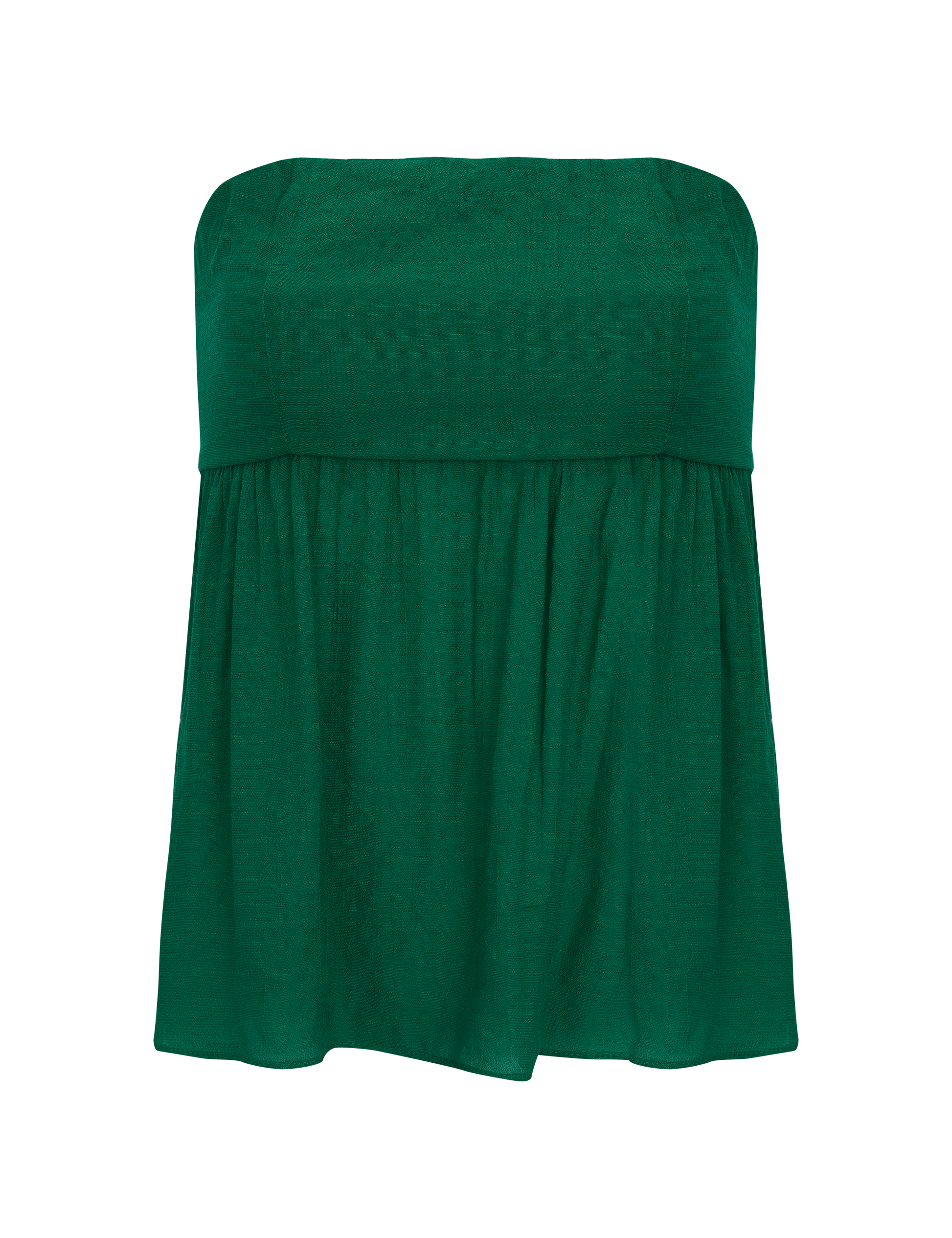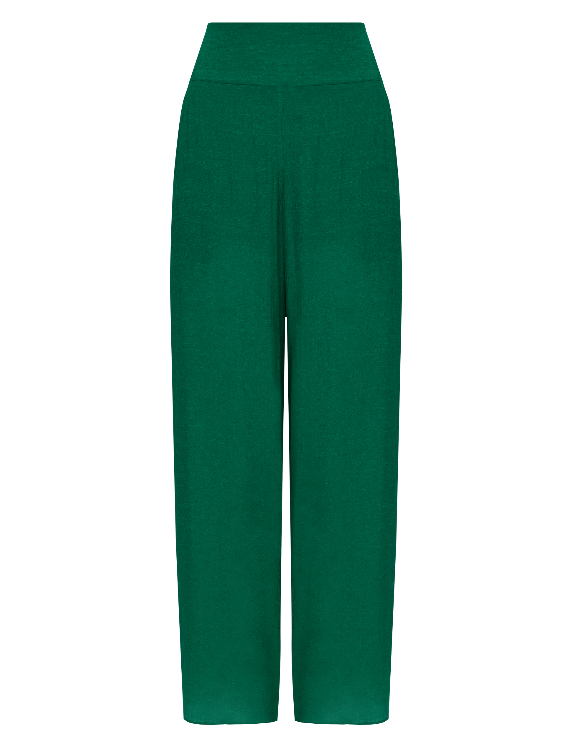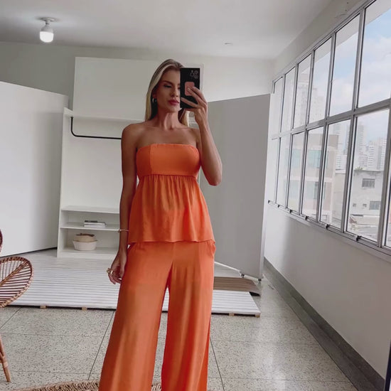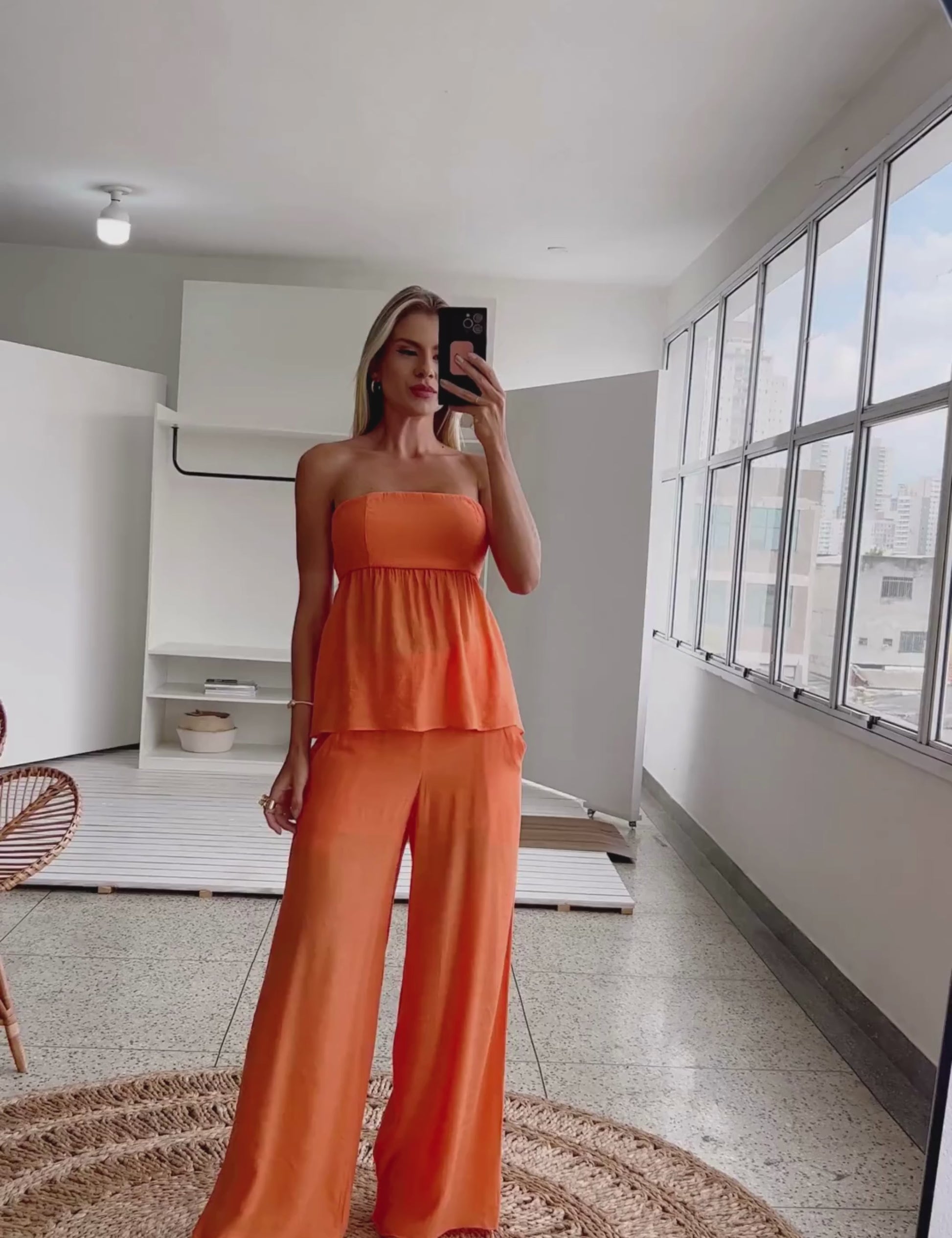 Conjunto com forro, confeccionado em poliviscose texturizado com aspecto de linho. A blusa não possui mangas, conta com silicone elástico interno no decote, que é reto; possui recortes no busto, franzidinhos logo abaixo dele, com tecido soltinho e lastex franzido nas costas para melhor ajuste ao corpo. A calça é pantalona e possui pala no cós, que é largo; bolsos laterais e fechamento lateral por zíper invisível.