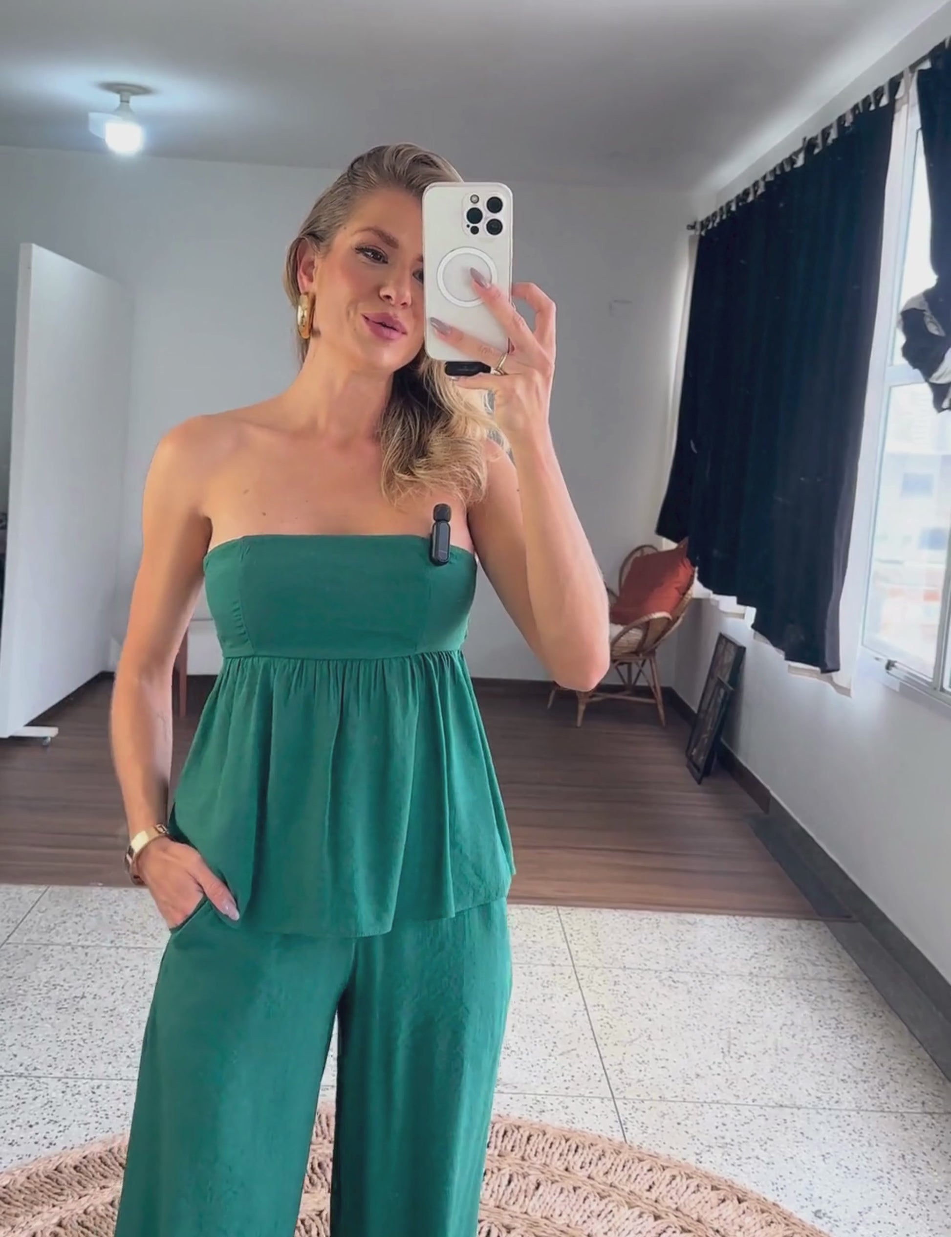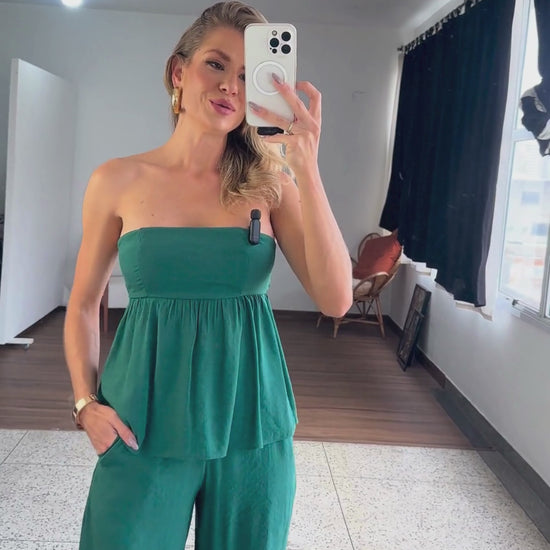 Conjunto com forro, confeccionado em poliviscose texturizado com aspecto de linho. A blusa não possui mangas, conta com silicone elástico interno no decote, que é reto; possui recortes no busto, franzidinhos logo abaixo dele, com tecido soltinho e lastex franzido nas costas para melhor ajuste ao corpo. A calça é pantalona e possui pala no cós, que é largo; bolsos laterais e fechamento lateral por zíper invisível.