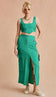 Conjunto com forro, confeccionado em crepe de poliviscose mais encorpadinho com aspecto de linho e efeito amassadinho. O top é no estilo corset e possui decote quadrado, alças largas com reguladores de metal, recortes frontais com barbatanas para estruturar a peça, recorte com 'ponta' na barra e lastex franzido nas costas para melhor ajuste ao corpo. A saia é longa e ajustada, possui elástico franzido no cós, fechamento frontal por zíper de metal com conchinha da Laguna gravada pingente, bolsos 'faca' laterais, maxi bolsos laterais com lapela e fechamento por corda e argolas meia lua de metal, bolsos amplos próximos à barra e recorte com fenda frontal.