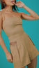 Conjunto confeccionado em crepe de alfaiataria. O top possui decote reto, tecido duplo no busto para não ficar transparente, alcinhas reguláveis e lastex franzido nas costas para melhor ajuste ao corpo. O shorts é ajustado na cintura e soltinho nas pernas, possui forro, fechamento traseiro por zíper invisível, bolsos laterais, pregas frontais e recortes vazados na frente, logo abaixo do cós, com aplicação de correntinhas de metal penduradas.