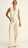 Conjunto confeccionado em linho com forro. O colete é cropped e possui modelagem soltinha, lapela dobrada na gola estilo blazer, fechamento frontal por fileira dupla de botões forrados e recortes que modelam a peça. A calça é pantalona e possui fechamento frontal por zíper e botão forrado, passantes frontais que criam uma prega com volume que é super elegante, bolsos traseiros e passantes comuns nas costas.