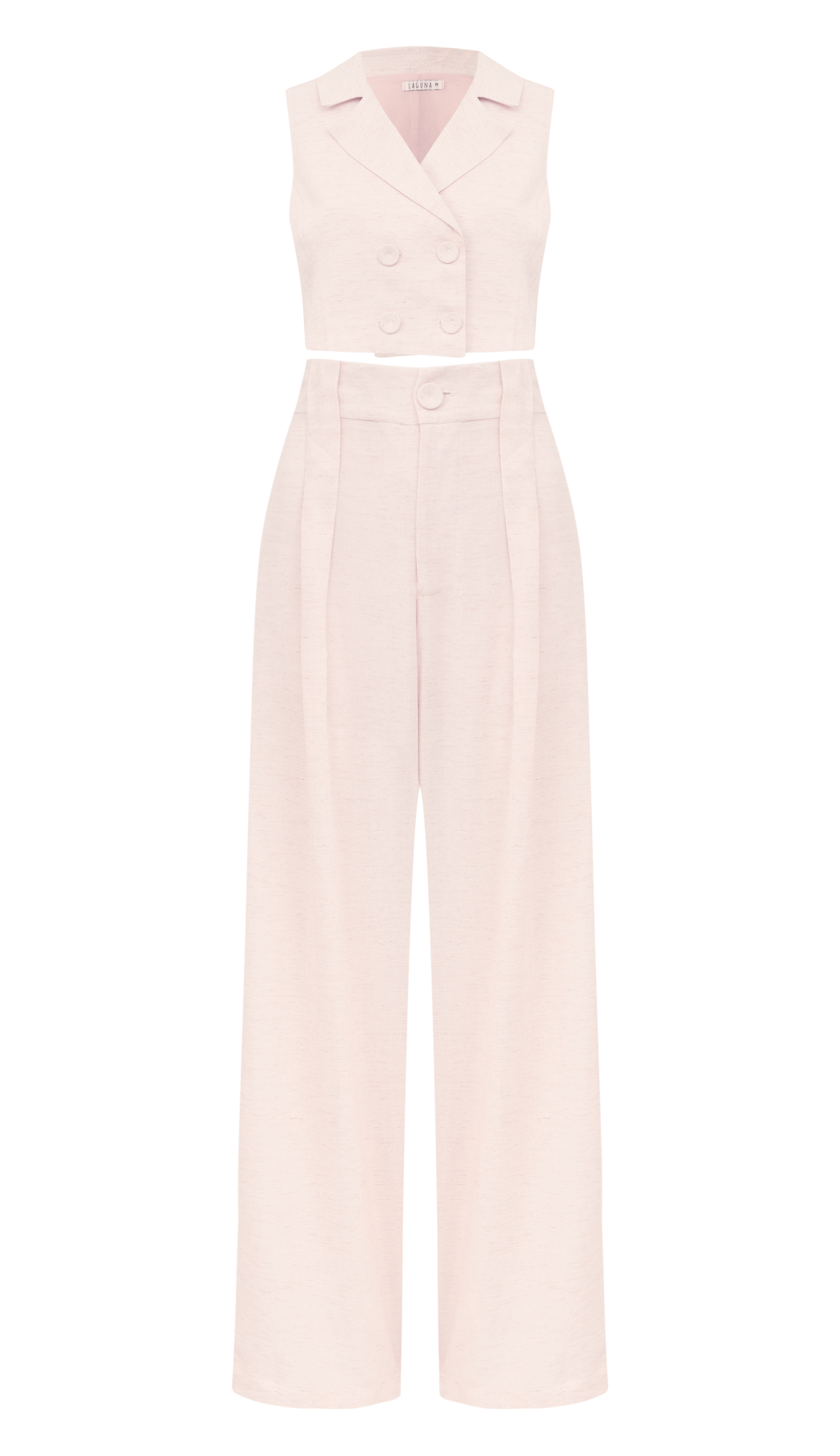 Conjunto confeccionado em linho com forro. O colete é cropped e possui modelagem soltinha, lapela dobrada na gola estilo blazer, fechamento frontal por fileira dupla de botões forrados e recortes que modelam a peça. A calça é pantalona e possui fechamento frontal por zíper e botão forrado, passantes frontais que criam uma prega com volume que é super elegante, bolsos traseiros e passantes comuns nas costas.