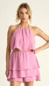 Conjunto confeccionado em crepe leve. A blusa é cropped e frente única, possui decote halter com franzidinhos na gola, decote bem aberto nas costas com tirinhas bem compridas para ajuste, transpasse e amarração na nuca e costas, com ponteiras de metal em formato de cocnhinha; conta também com tecido duplo no busto para não ficar transparente, sendo o de baixo mais justinho com elástico na barra para maior conforto e o de cima, sobreposto a este, mais soltinho e fluido. O shorts é soltinho, possui forro e fechamento lateral por zíper invisível. E acompanha ainda uma sainha em camadas pra sobrepor ao shorts, que tem modealgem evasê, elástico franzido no cós e azelhas laterais para transpassar a tirinha da blusa, fixando-a à parte de baixo.