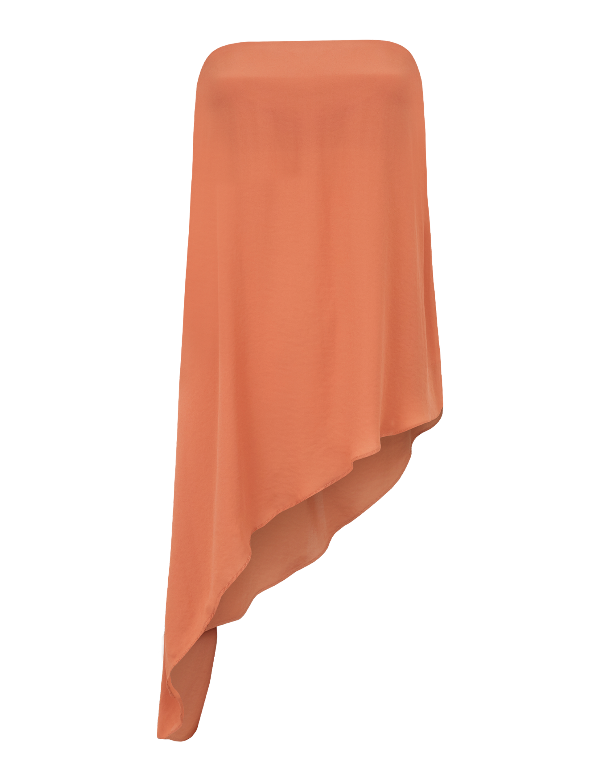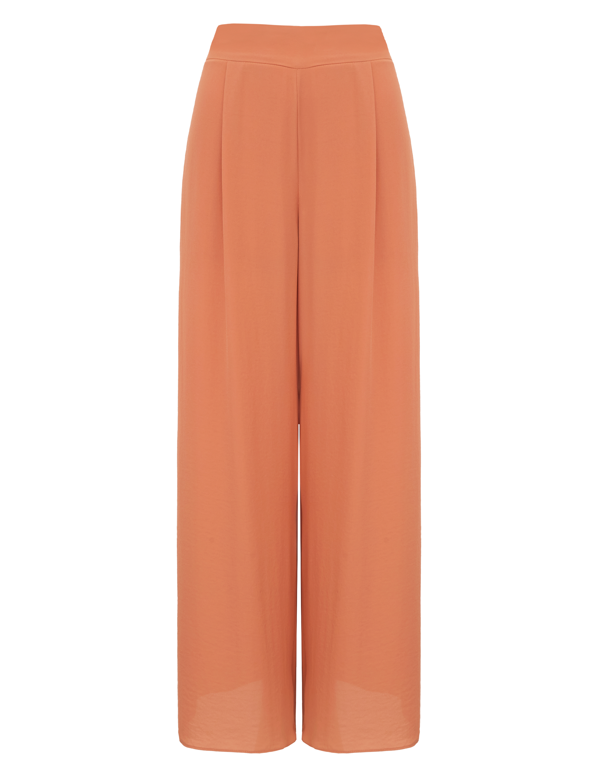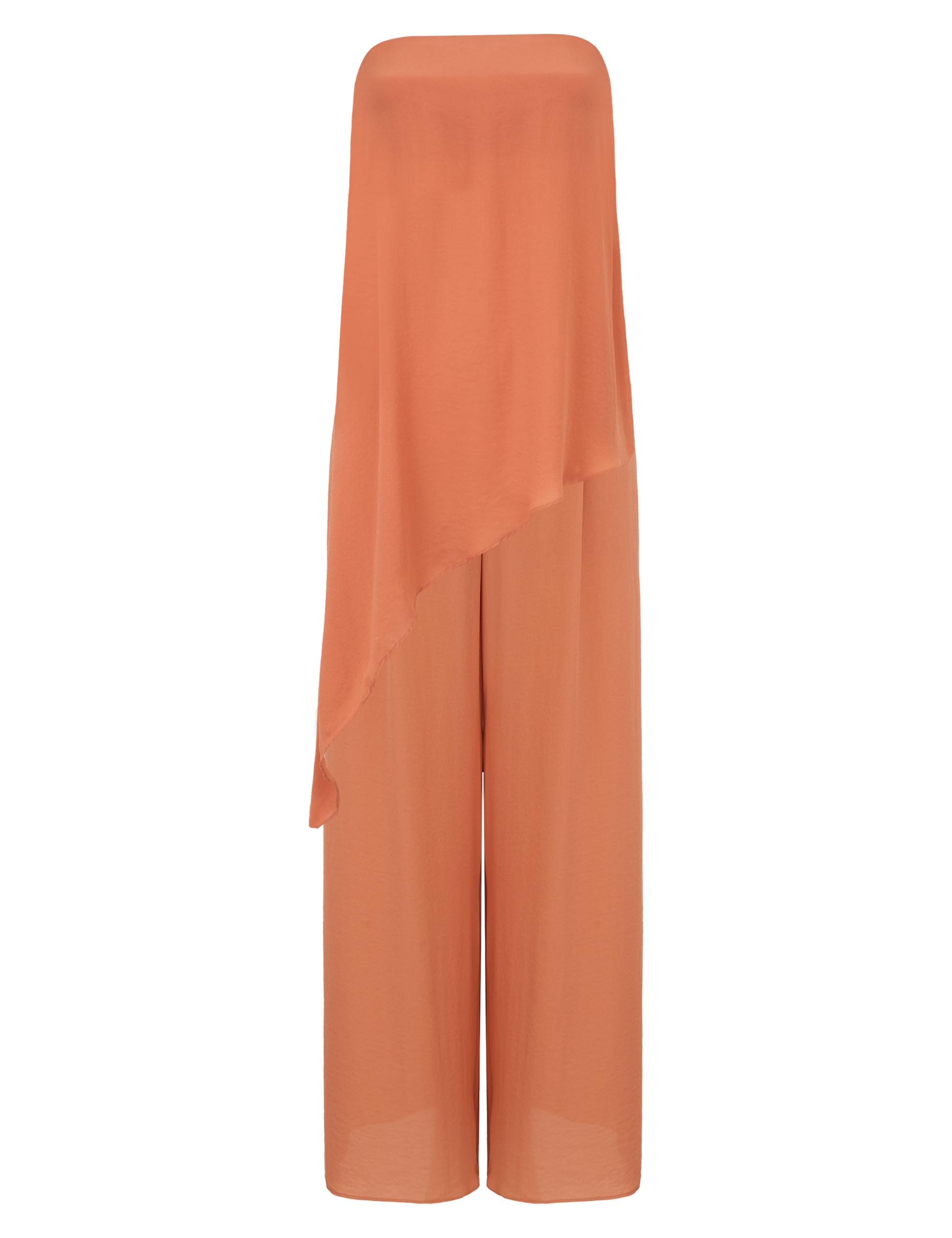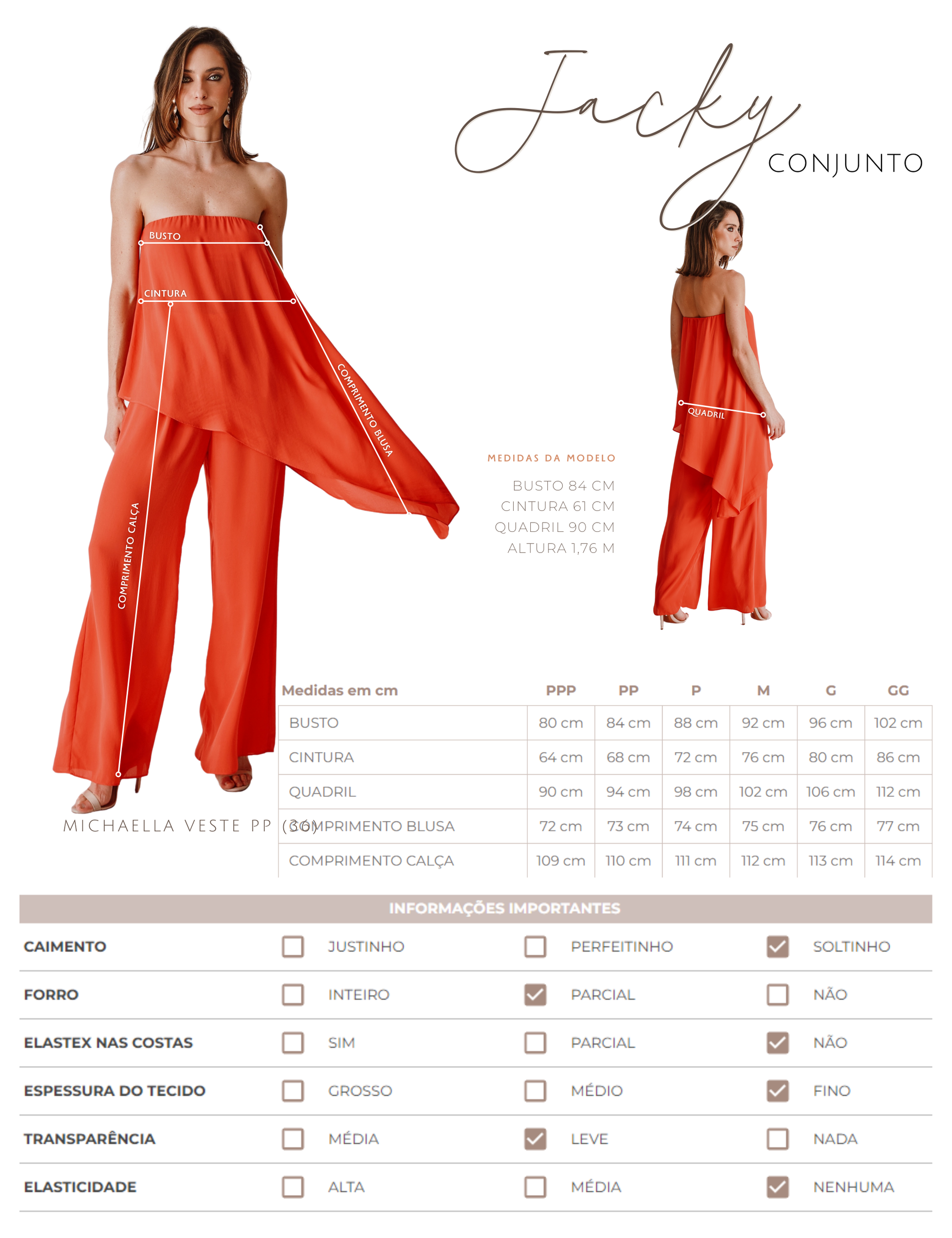 Conjunto confeccionado em crepe com forro. A blusa não possui manga e conta com decote reto com elástico interno; top de forro fixo no busto com elástico também para melhor sustentação e modelagem ampla e alongada com recorte assimétrico na barra. A calça é pantalona, possui pregas frontais, cós largo e fechamento lateral por zíper invisível.