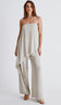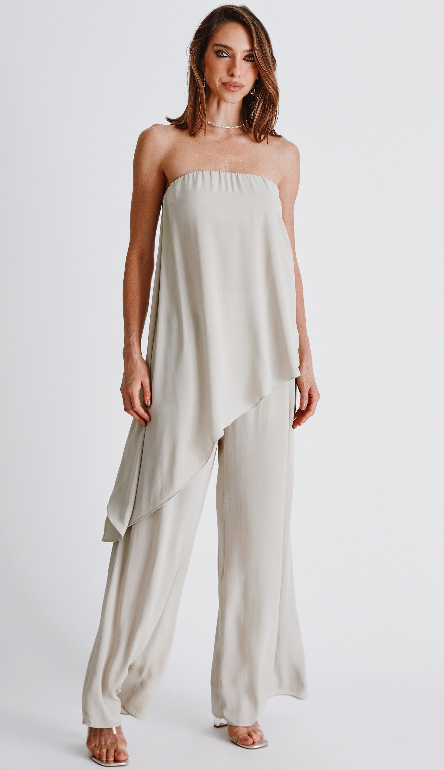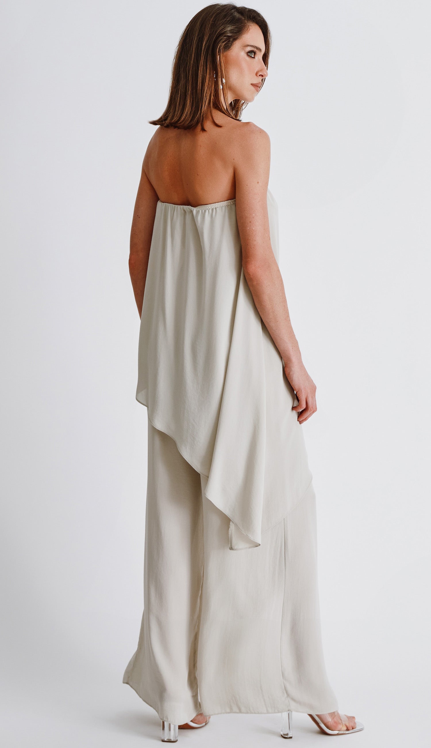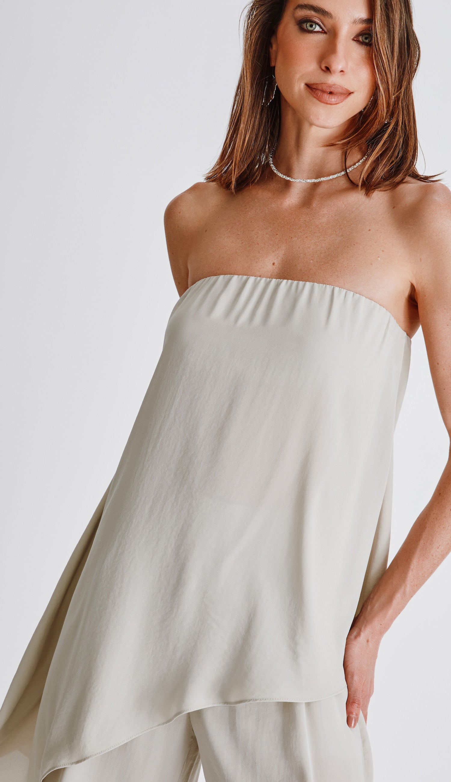 Conjunto confeccionado em crepe com forro. A blusa não possui manga e conta com decote reto com elástico interno; top de forro fixo no busto com elástico também para melhor sustentação e modelagem ampla e alongada com recorte assimétrico na barra. A calça é pantalona, possui pregas frontais, cós largo e fechamento lateral por zíper invisível.