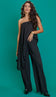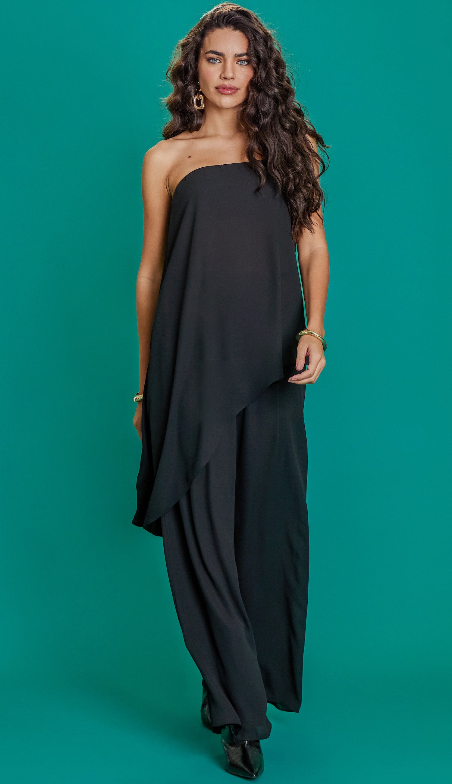 Conjunto confeccionado em crepe com forro. A blusa não possui manga e conta com decote reto com elástico interno; top de forro fixo no busto com elástico também para melhor sustentação e modelagem ampla e alongada com recorte assimétrico na barra. A calça é pantalona, possui pregas frontais, cós largo e fechamento lateral por zíper invisível.