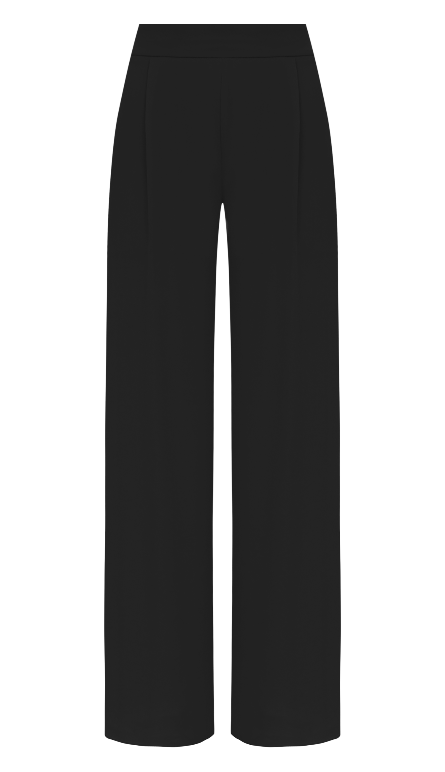Conjunto confeccionado em crepe com forro. A blusa não possui manga e conta com decote reto com elástico interno; top de forro fixo no busto com elástico também para melhor sustentação e modelagem ampla e alongada com recorte assimétrico na barra. A calça é pantalona, possui pregas frontais, cós largo e fechamento lateral por zíper invisível.