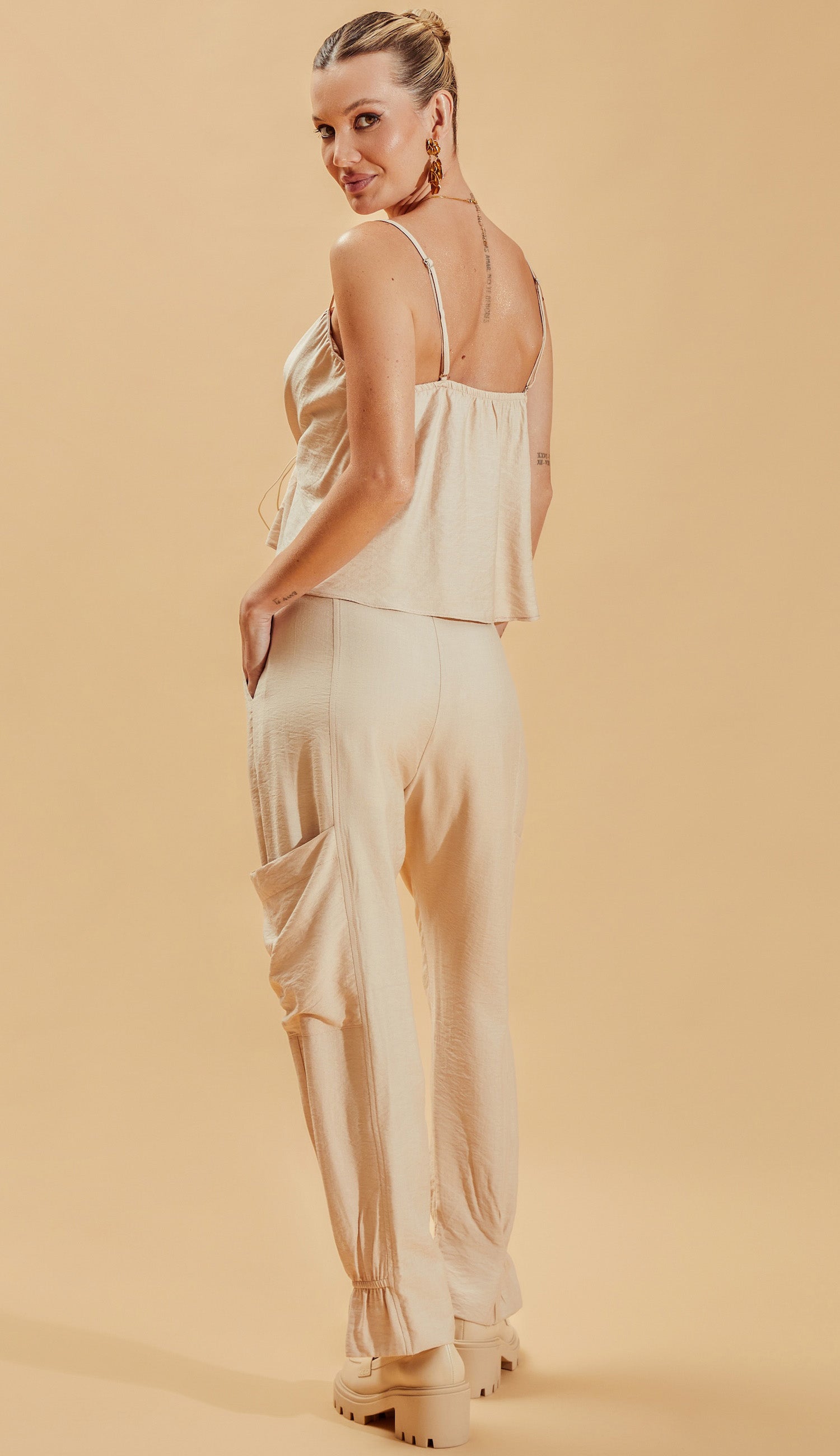 Conjunto com forro, confeccionado em poliviscose texturizado com aspecto de linho e efeito amassadinho. A blusa possui modelagem soltinha, decote reto, alcinhas reguláveis, elástico nas costas para maior conforto e ajuste frontal por elástico com reguladores para franzir e deixar a silhueta mais marcada. A calça possui fechamento frontal por zíper e botão forrado, passantes no cós, bolsos frontais e maxi bolsos nas pernas estilo cargo, recortes nas pernas e barra ajustada por elástico franzido embutido.