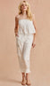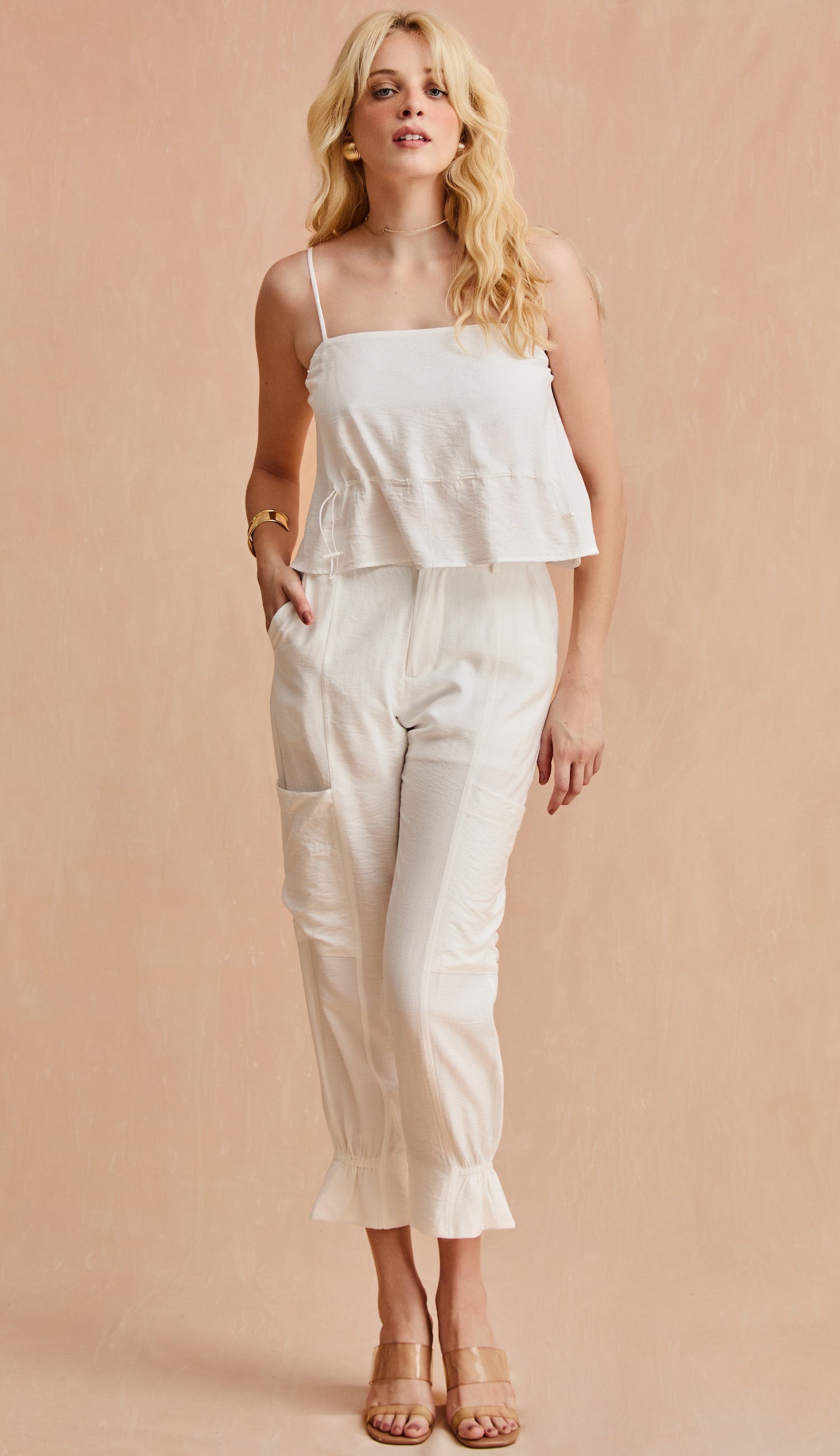 Conjunto com forro, confeccionado em poliviscose texturizado com aspecto de linho e efeito amassadinho. A blusa possui modelagem soltinha, decote reto, alcinhas reguláveis, elástico nas costas para maior conforto e ajuste frontal por elástico com reguladores para franzir e deixar a silhueta mais marcada. A calça possui fechamento frontal por zíper e botão forrado, passantes no cós, bolsos frontais e maxi bolsos nas pernas estilo cargo, recortes nas pernas e barra ajustada por elástico franzido embutido.