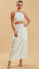 Conjunto com forro, confeccionado em crepe de poliviscose texturizado com efeito amassadinho. O top possui decote halter, alcinhas compridas para amarração no pescoço, lastex nas costas para maior conforto e recortes frontais com elástico embutido e reguladores para franzir. A saia é longa e possui elástico franzido no cós, maxi bolsos frontais aplicados com lapela estilo cargo, recorte frontal, detalhe nas laterais de elástico embutido com reguladores para franzir e fechamento traseiro zíper de metal com pingente que possui o delicado detalhe da conchinha da Laguna gravado no metal, o que dá um charme todo especial à peça.