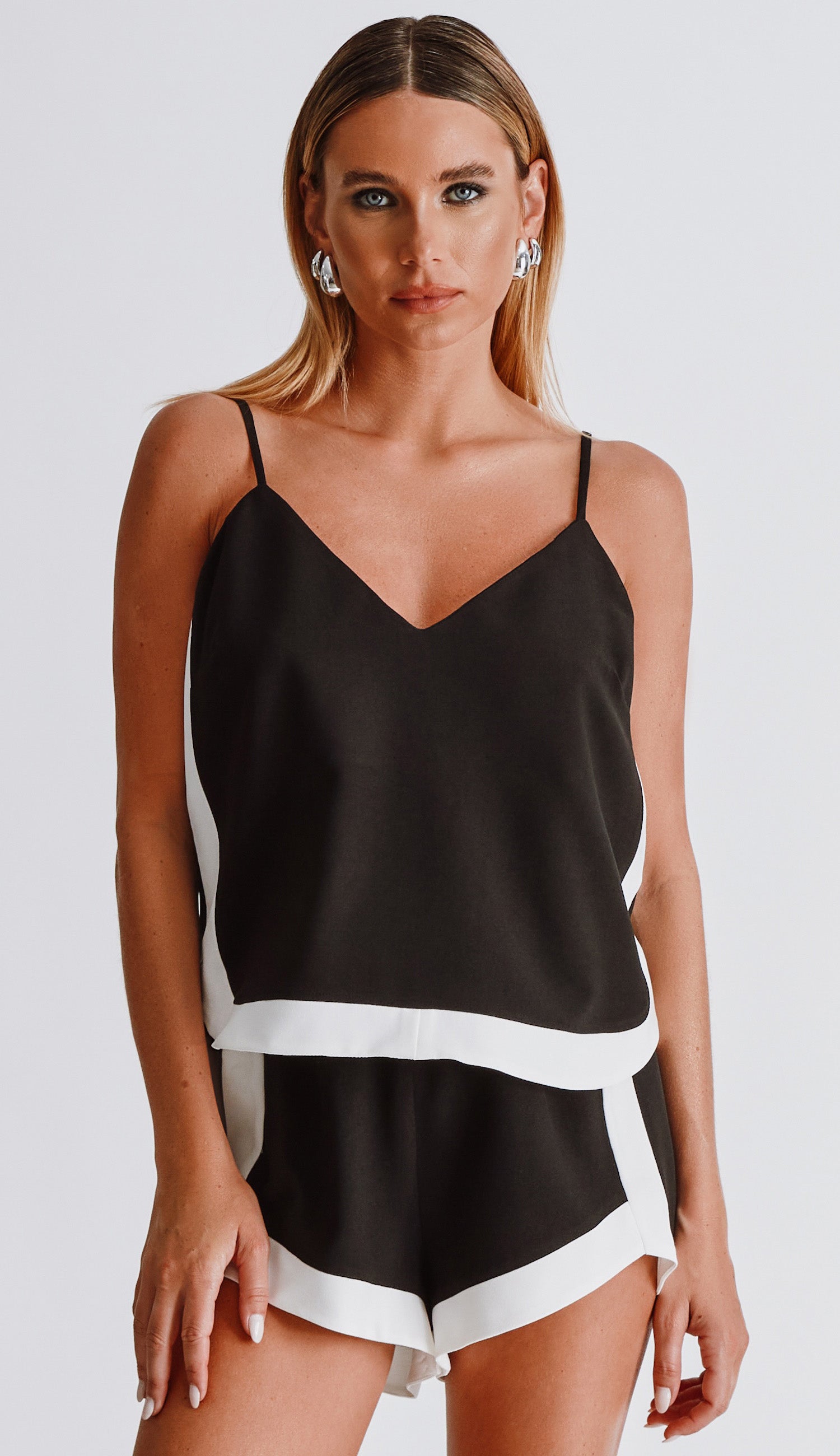 Conjunto confeccionado em crepe de alfaiataria. A blusa possui modelagem soltinha, decote em V frente e costas, alcinhas reguláveis e detalhe bicolor nas laterais e na barra. O shorts possui modelagem soltinha no estilo boxer com barra arredondada na frente, elástico grosso franzido no cós e detalhe de recorte frontal e barra bicolor.