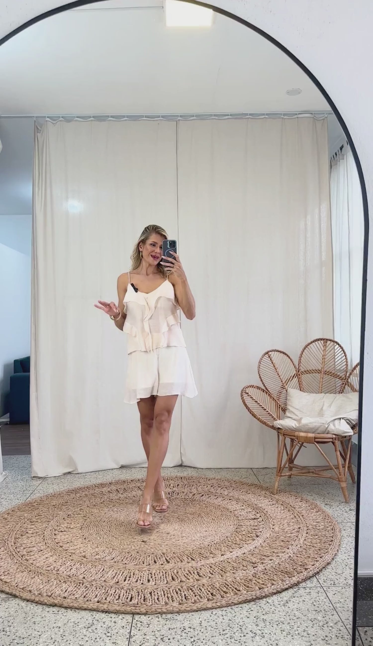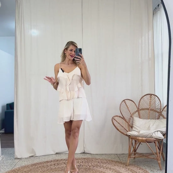 Conjunto com forro, confeccionado em poliviscose texturizado com aspecto de linho. A blusa possui forro no busto com elástico interno para ajuste ao corpo e maior conforto. Conta ainda com decote em V, alcinhas reguláveis, botõezinhos esmaltados de enfeite, elástico interno nas costas, aplicação de babado vertical em cascata no centro e aplicação assimétrica também nas laterais. O shorts possui modelagem soltinha e fechamento lateral por zíper invisível.