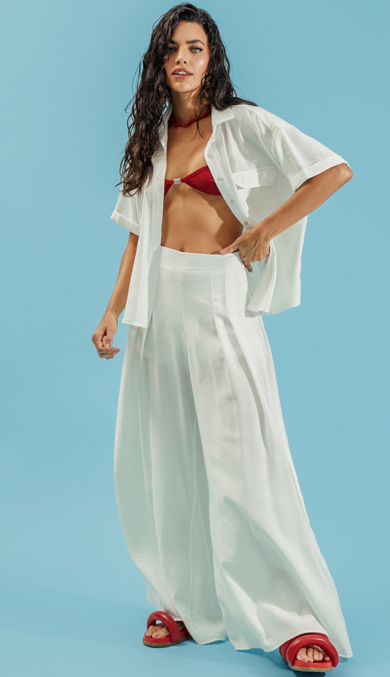 Conjunto confeccionado em crepe de poliviscose texturizado com efeito amassadinho. A camisa possui fechamento frontal por botões madrepérola, mangas curtas dobradas, gola e bolso com lapela frontal. A calça pantalona possui forro, pregas frontais e fechamento lateral por zíper invisível.