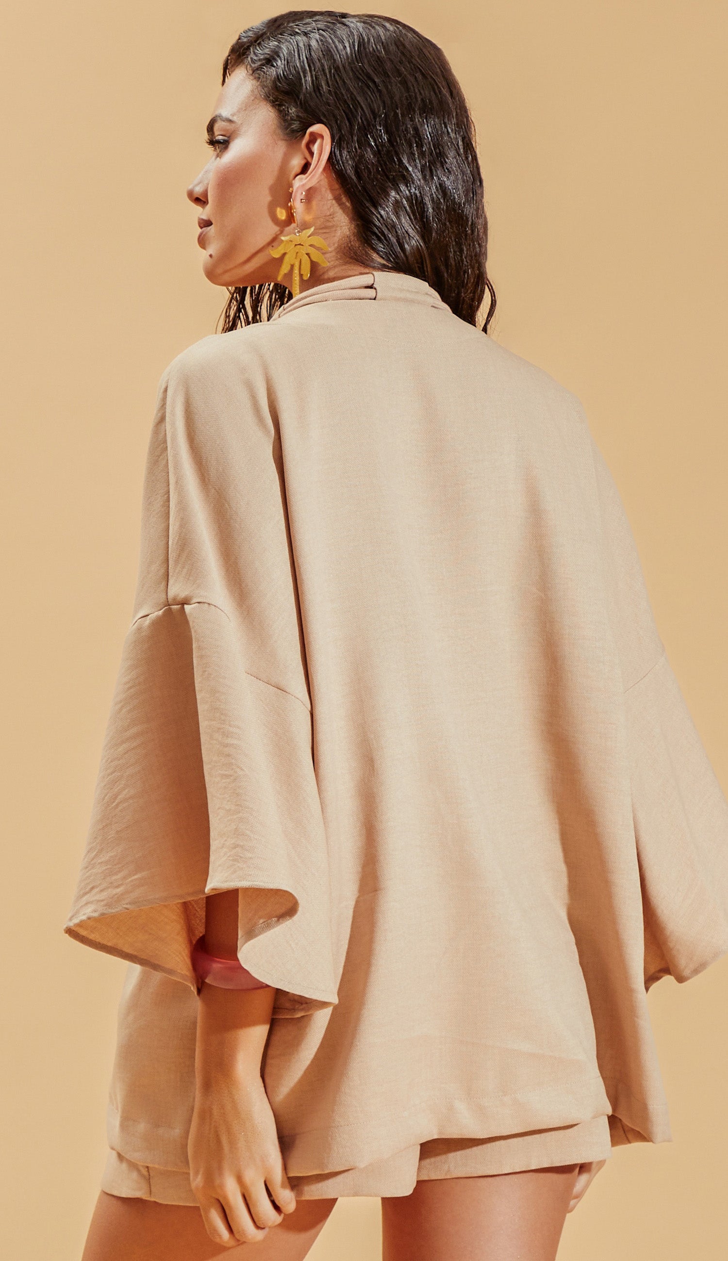 Trijunto confeccionado em poliéster maquinetado. O top possui forro, decote em V com recortes que modelam o busto, pala na cintura, alças grossas com elástico franzido atrás e lastex nas costas para maior conforto. O shorts saia também possui forro, recortes frontais, bolsos e fechamento lateral por zíper invisível. O kimono é amplo e aberto, conta com mangas sino 3/4 raglan e recorte frontal com detalhe de cordões e vazados.