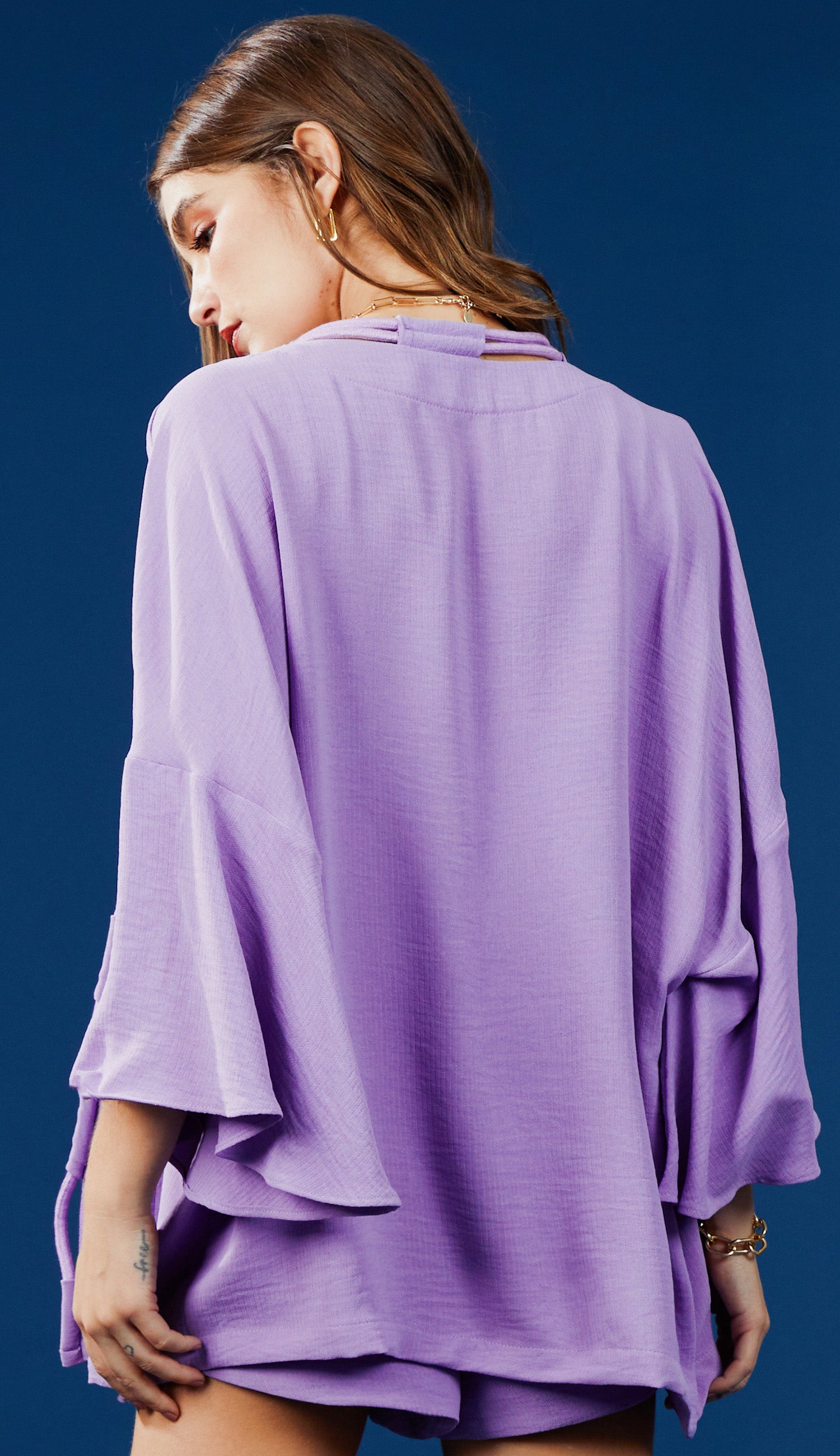 Trijunto confeccionado em crepe texturizado com efeito amassadinho. O top possui forro, decote em V com recortes que modelam o busto, pala na cintura, alças grossas com elástico franzido atrás e lastex nas costas para maior conforto. O shorts saia também possui forro, recortes frontais, bolsos e fechamento lateral por zíper invisível. O kimono é amplo e aberto, conta com mangas sino 3/4 raglan e recorte frontal com detalhe de cordões e vazados.
