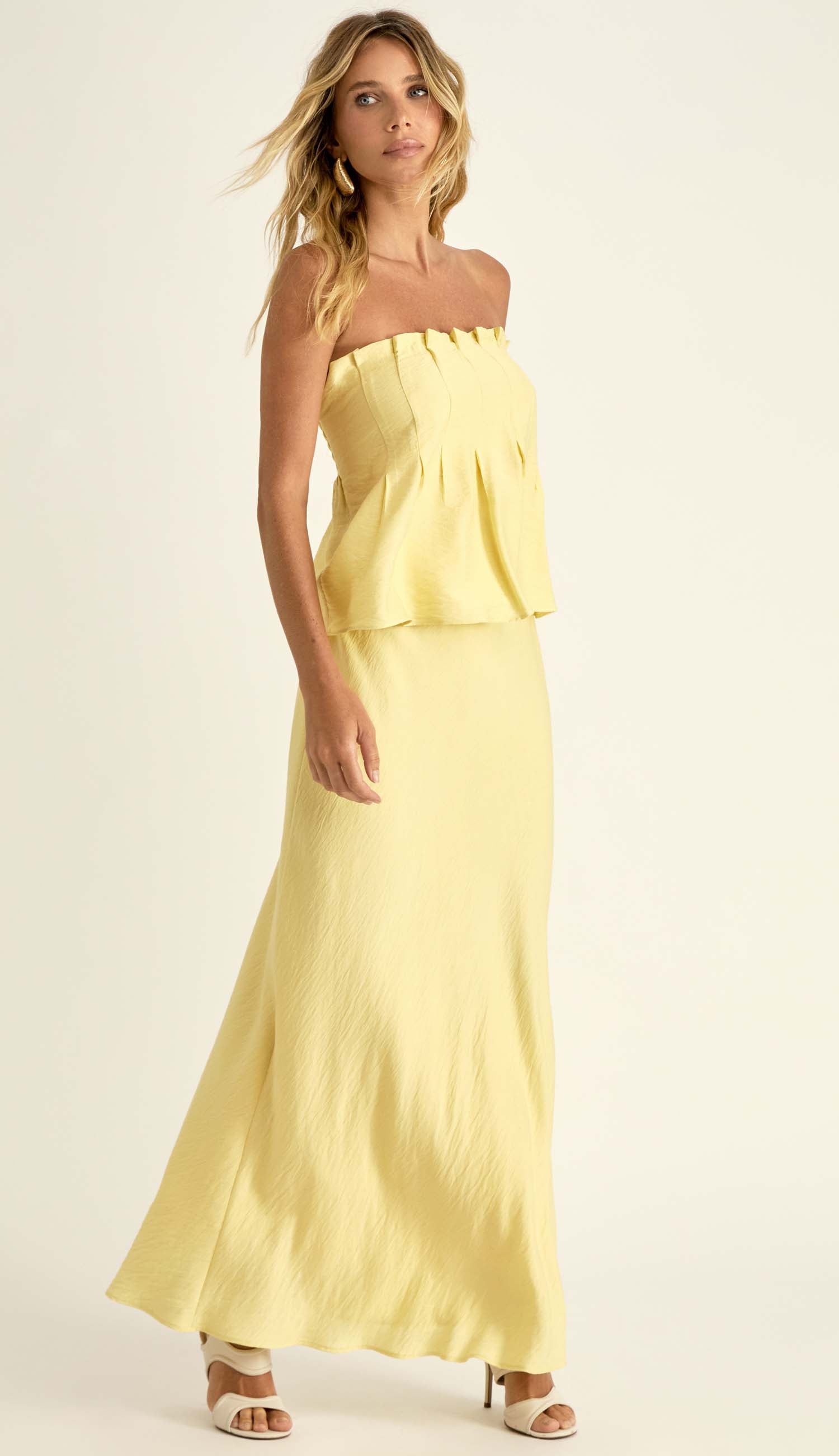 Conjunto com forro; confeccionado em poliviscose texturizada com aspecto amassadinho. A blusa não possui mangas e conta com decote reto com detalhe de preguinhas no busto que dão um volume muito charmoso, modelagem soltinha mais reta e lastex franzido nas costas para melhor ajuste ao corpo. A saia é longa, possui forro longo na peça inteira, elástico interno no cós e modelagem soltinha.