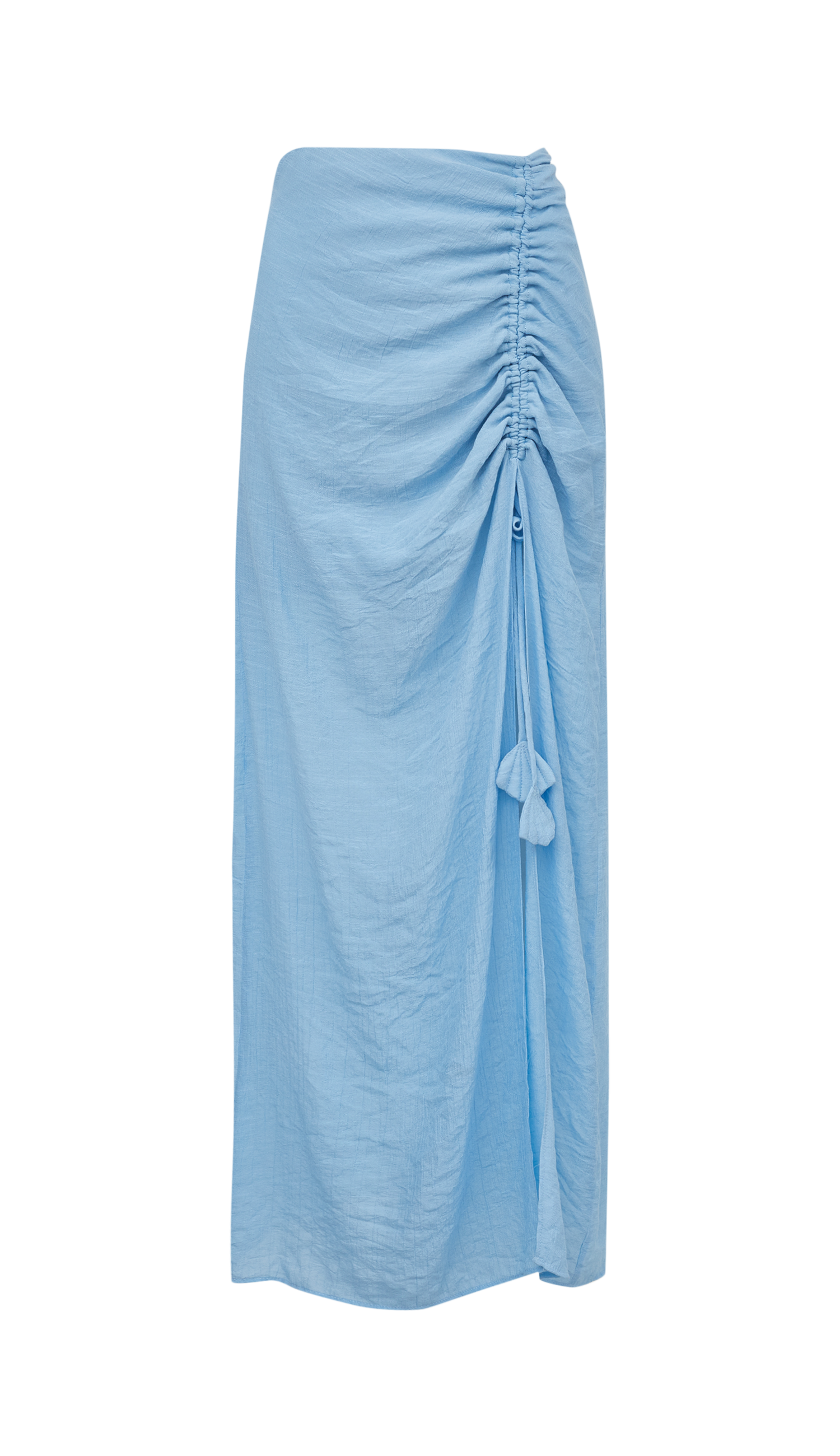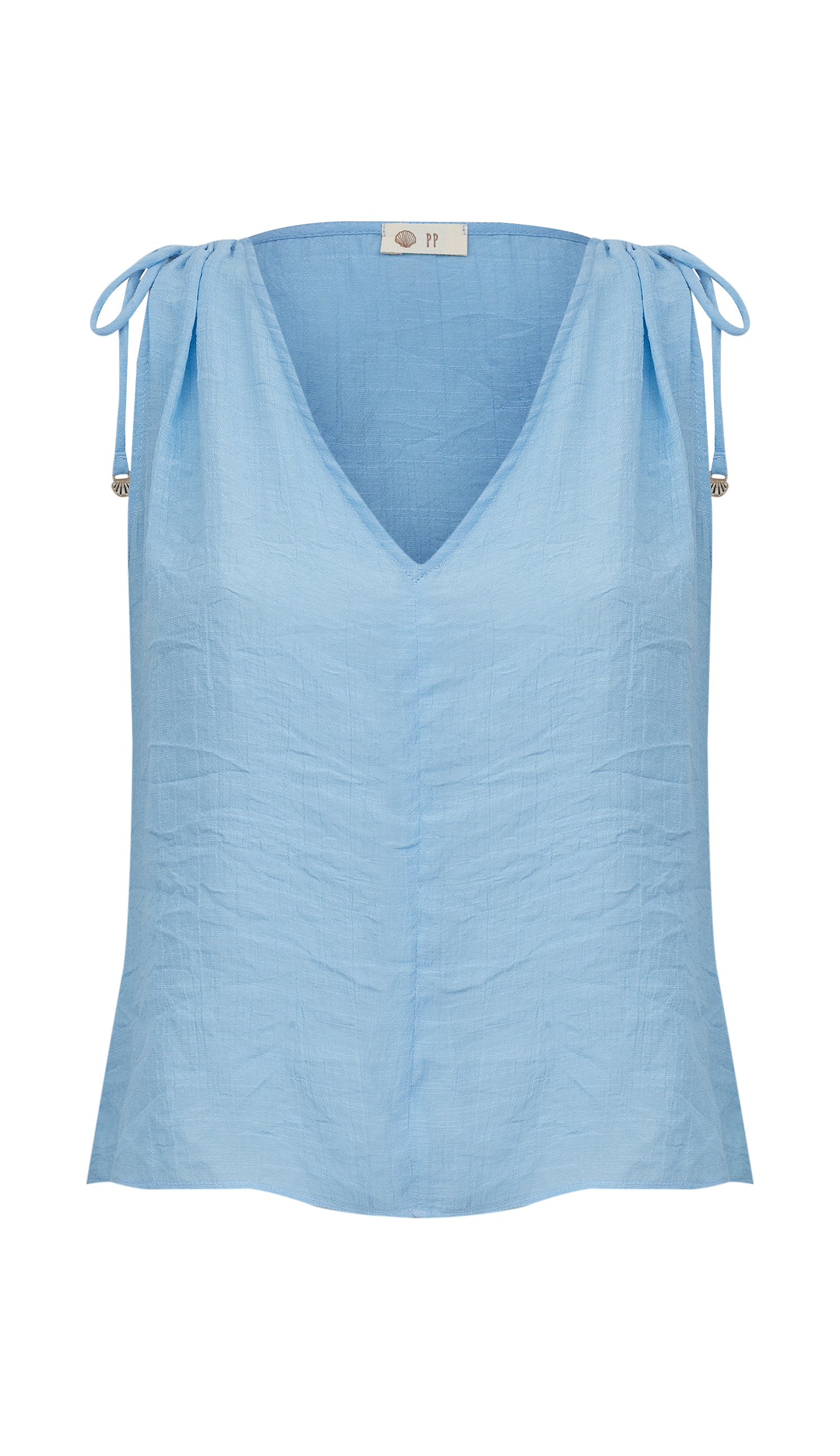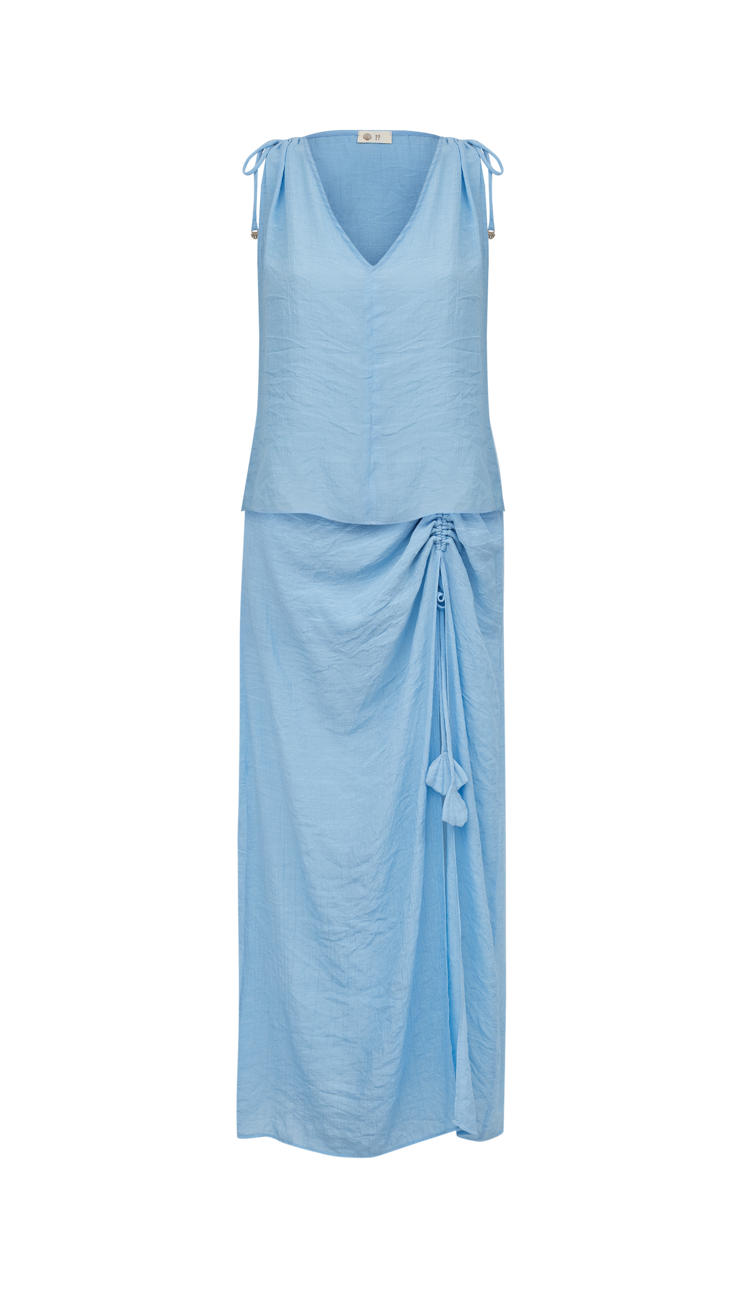 Conjunto confeccionado em poliviscose texturizado com aspecto de linho e efeito amassadinho. A regata possui decote em V, modelagem soltinha, tirinhas embutidas nos ombros para franzir, com ponteiras de metal em formato de conchinha e uma sutil e delicada transparência na peça por não possuir forro. A saia é longa e ajustada; possui forro curto, fechamento traseiro por zíper invisível, tirinhas verticais embutidas na lateral para franzir em efeito drapeado e ajustar o tamanho da fenda que tem logo em seguida e nas pontas das tirinhas ainda conta com o charmoso detalhe de tecido aplicado em formato de concha com pespontos.