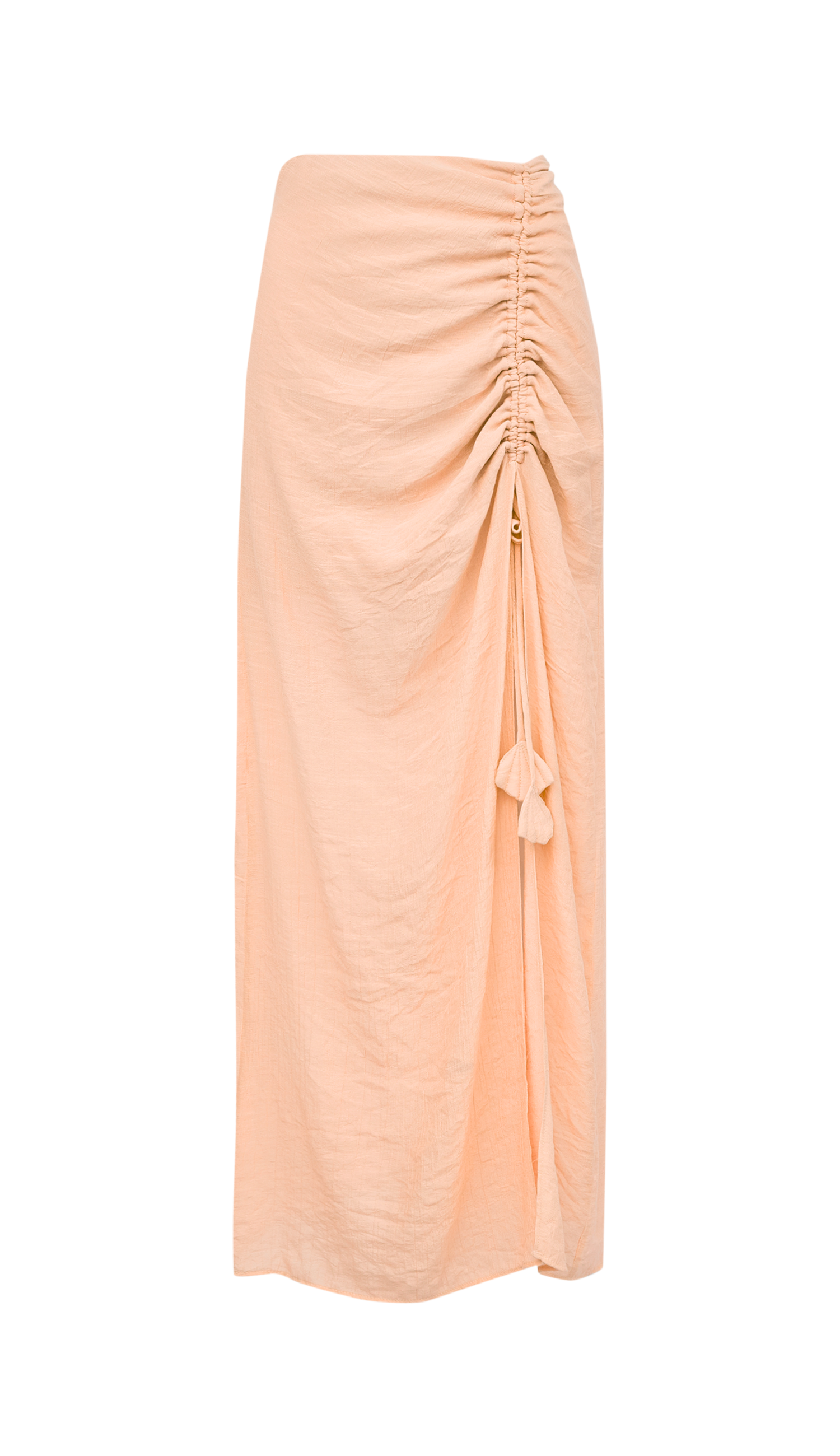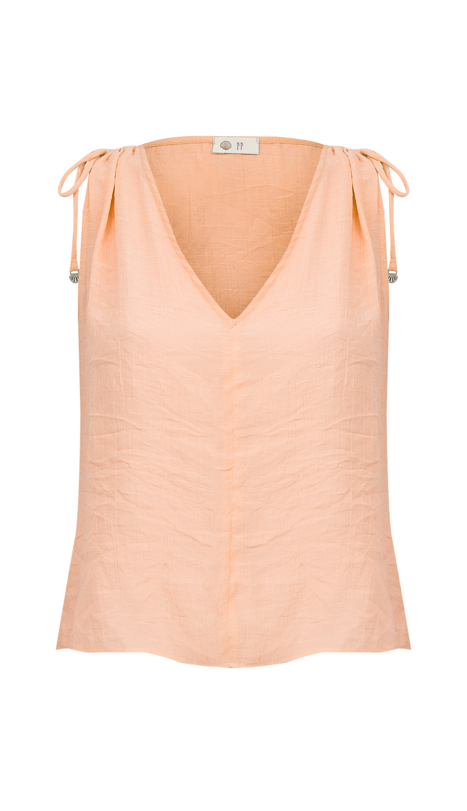 Conjunto confeccionado em poliviscose texturizado com aspecto de linho e efeito amassadinho. A regata possui decote em V, modelagem soltinha, tirinhas embutidas nos ombros para franzir, com ponteiras de metal em formato de conchinha e uma sutil e delicada transparência na peça por não possuir forro. A saia é longa e ajustada; possui forro curto, fechamento traseiro por zíper invisível, tirinhas verticais embutidas na lateral para franzir em efeito drapeado e ajustar o tamanho da fenda que tem logo em seguida e nas pontas das tirinhas ainda conta com o charmoso detalhe de tecido aplicado em formato de concha com pespontos.