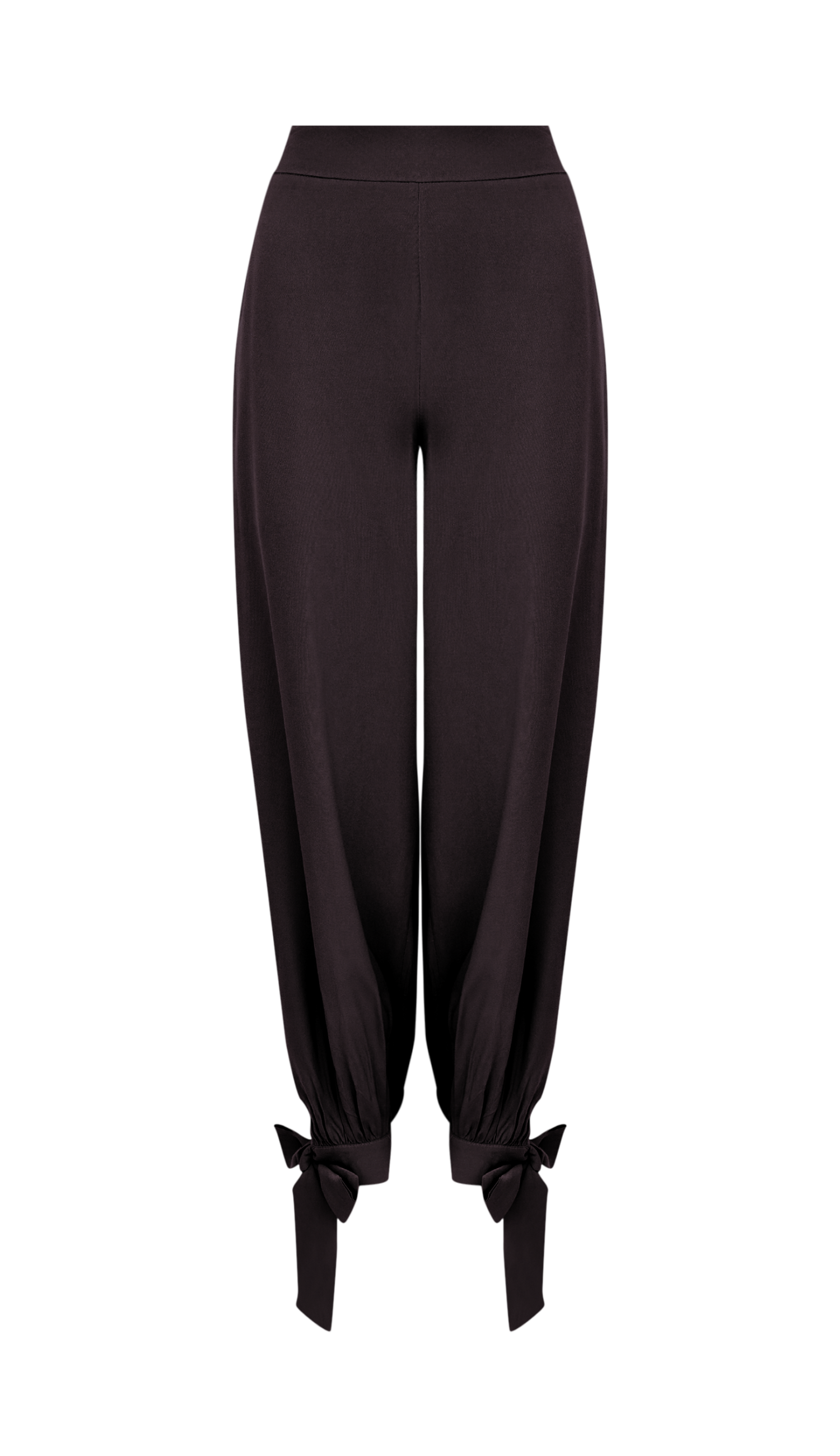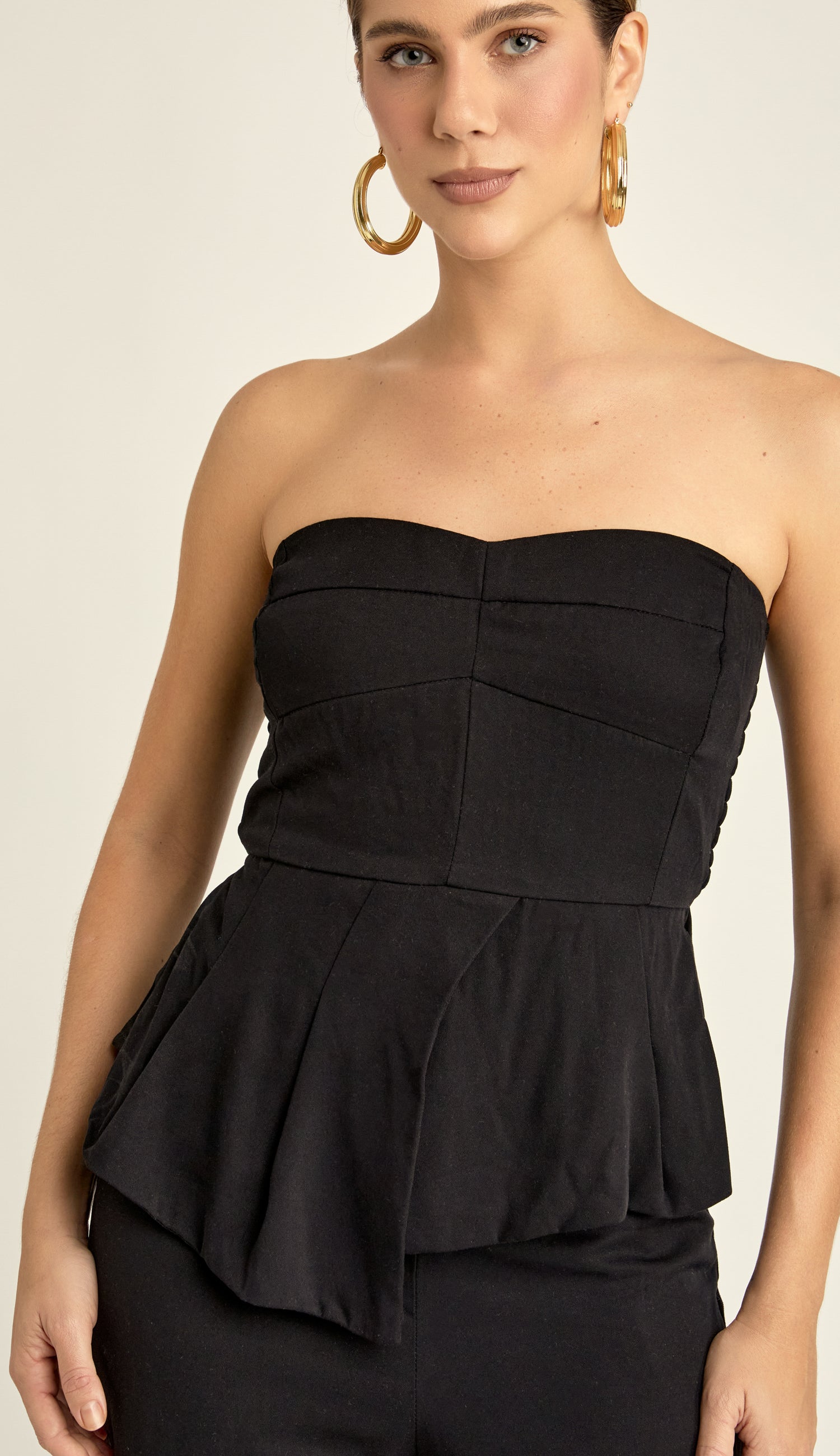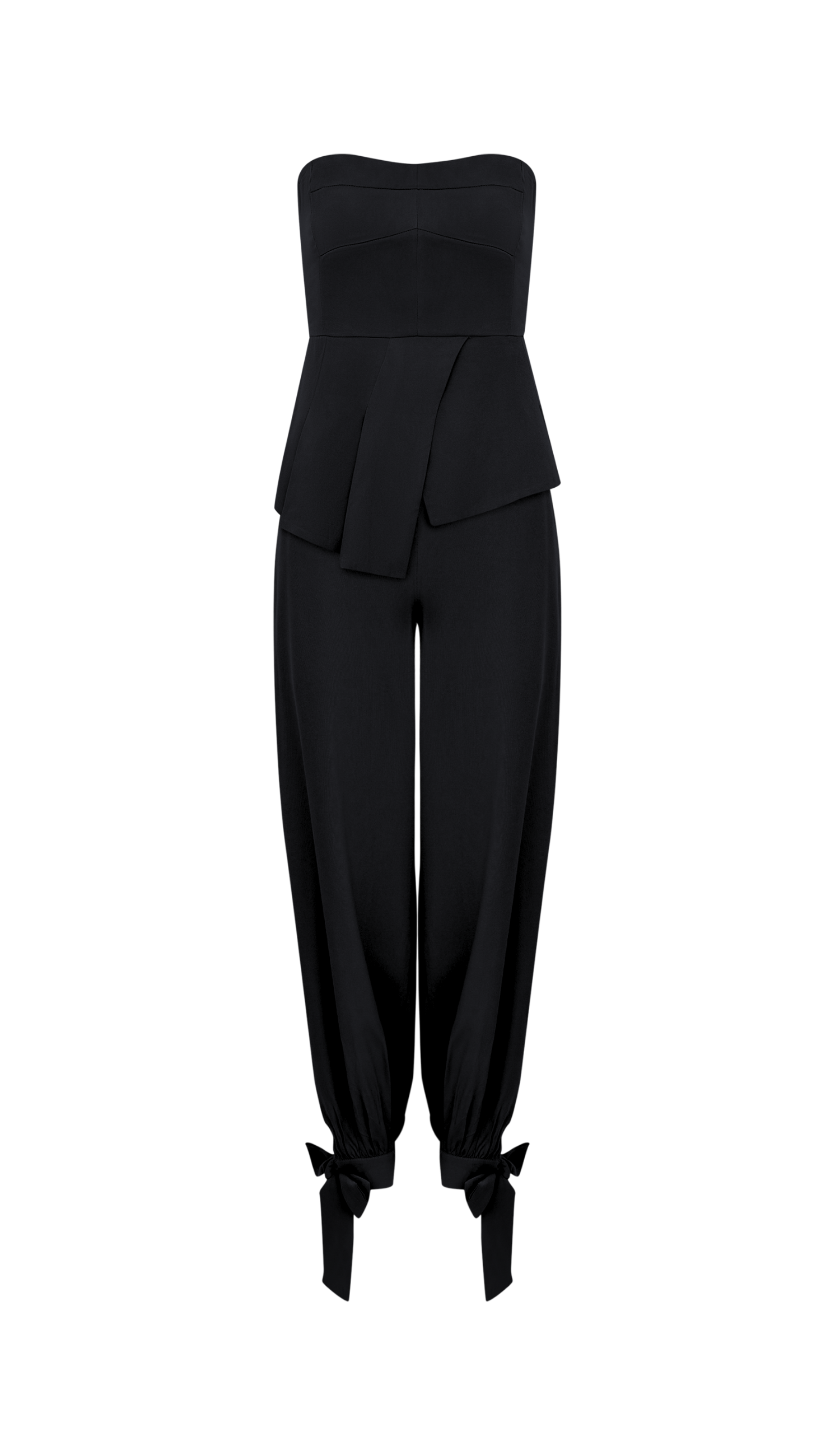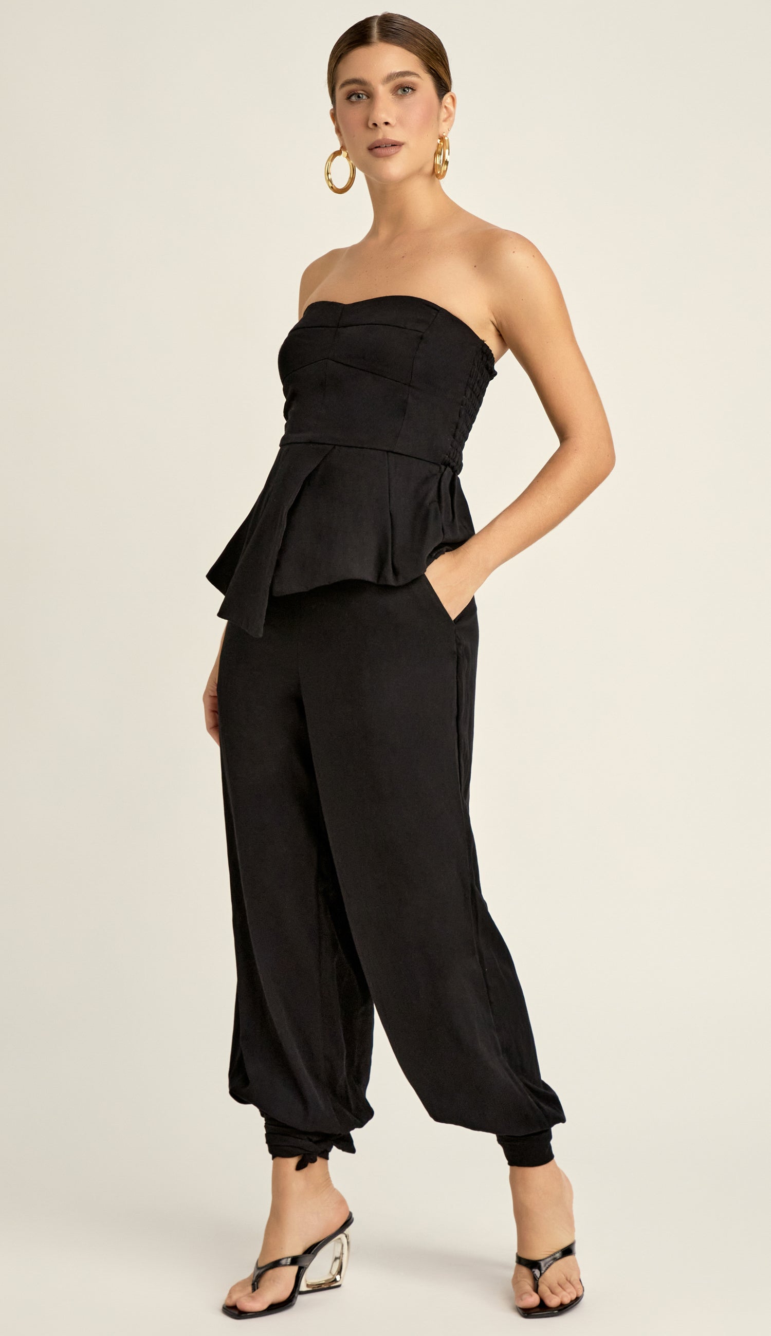 Conjunto confeccionado em viscose twill com forro. A blusa não tem mangas, possui decote reto com silicone elástico interno para maior segurança, recortes que modelam o busto, lastex franzido nas costas para melhor ajuste, babadinho na cintura com pregas e fenda e barra assimétrica. A calça possui fechamento lateral por zíper invisível, bolsos faca laterais e modelagem aladim, soltinha nas pernas e justinha na barra com franzidos e tiras no punho para amarrar.