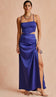 Conjunto confeccionado em cetim com forro. O top possui decote reto, alcinhas reguláveis, recortes frontais com barra arredondada no estilo corset estruturado com barbatanas e lastex franzido nas costas para melhor ajuste ao corpo. A saia é longa, fechamento lateral por zíper invisível e modelagem ajustada ao corpo com recorte franzido lateral com tirinhas embutidas para para ajuste da fenda e amarração.