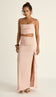 Conjunto com forro confeccionado em crepe texturizado com efeito amassadinho. O top possui decote reto, alcinhas reguláveis, recortes frontais com barra arredondada no estilo corset estruturado com barbatanas e lastex franzido nas costas para melhor ajuste ao corpo. A saia é longa, fechamento lateral por zíper invisível e modelagem ajustada ao corpo com recorte franzido lateral com tirinhas embutidas para para ajuste da fenda e amarração.