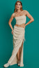 Conjunto confeccionado em cetim com forro. O top possui decote reto, alcinhas reguláveis, recortes frontais com barra arredondada no estilo corset estruturado com barbatanas e lastex franzido nas costas para melhor ajuste ao corpo. A saia é longa, fechamento lateral por zíper invisível e modelagem ajustada ao corpo com recorte franzido lateral com tirinhas embutidas para para ajuste da fenda e amarração.