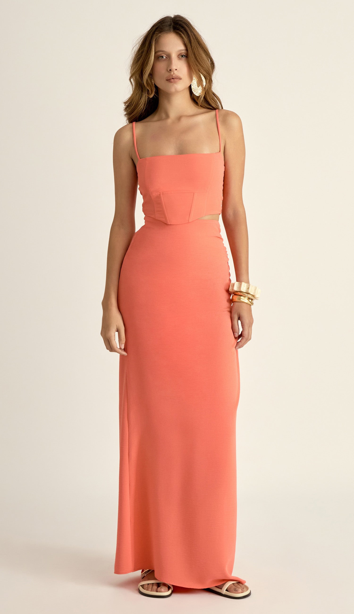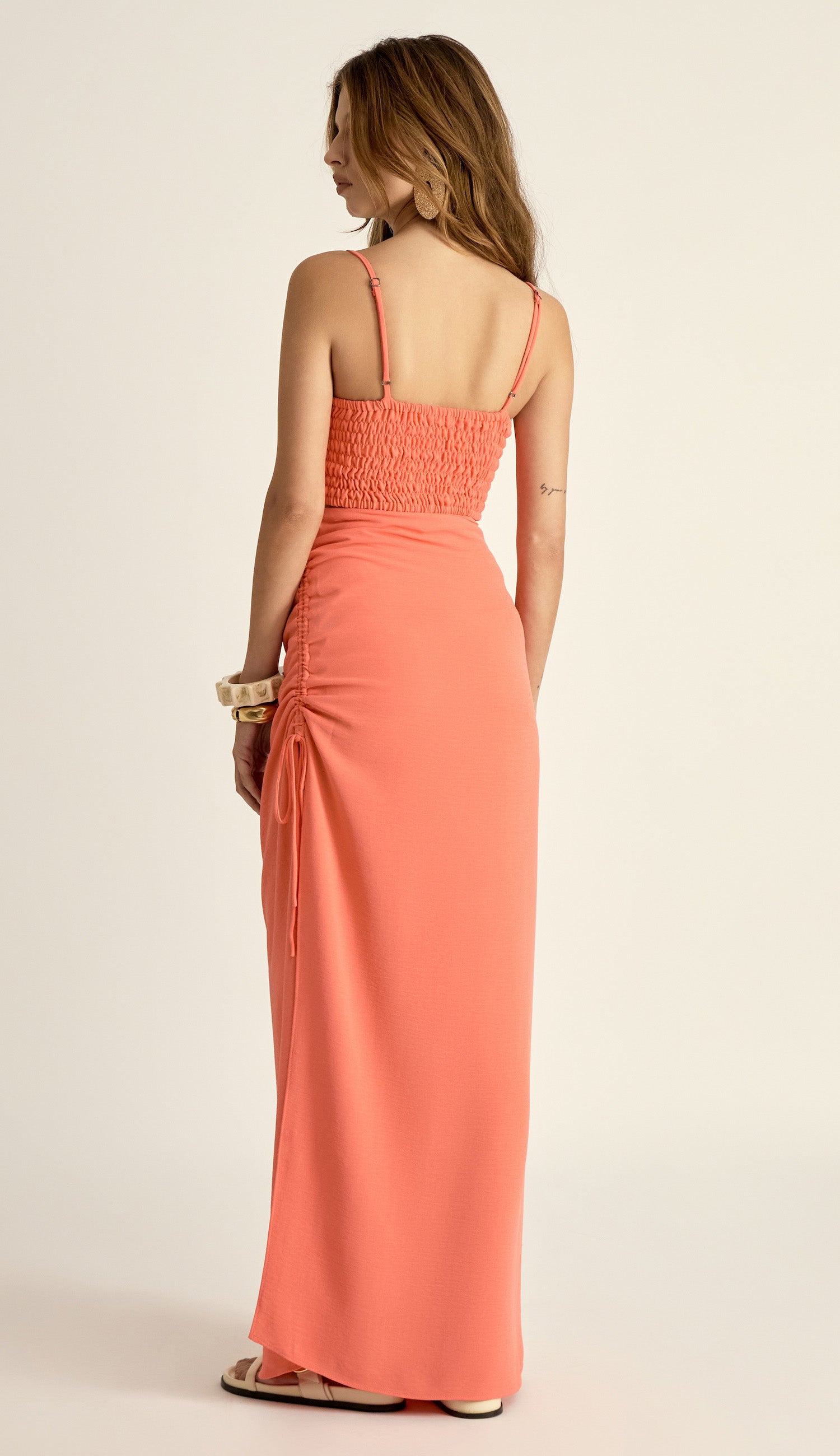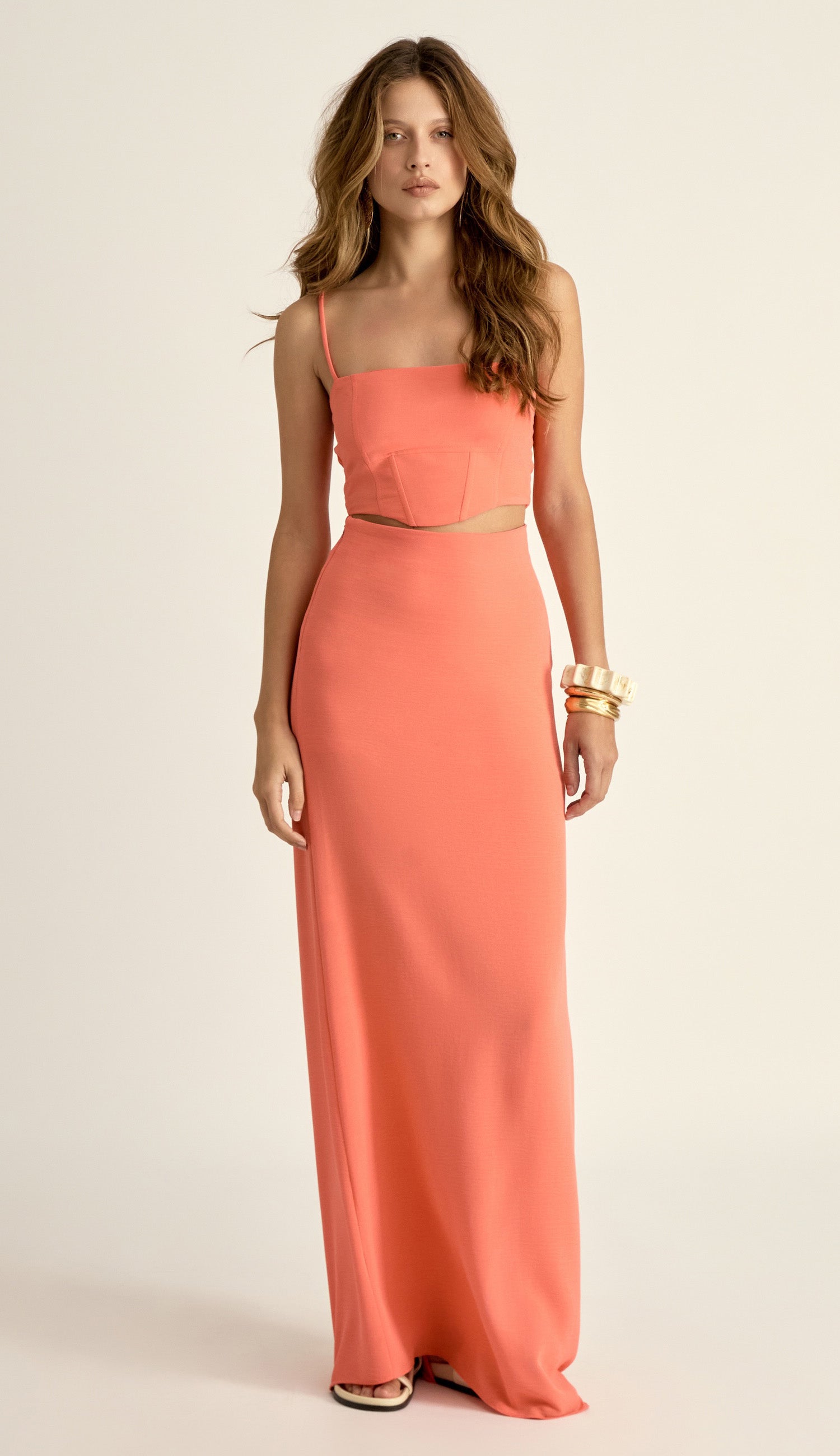 Conjunto com forro confeccionado em crepe texturizado com efeito amassadinho. O top possui decote reto, alcinhas reguláveis, recortes frontais com barra arredondada no estilo corset estruturado com barbatanas e lastex franzido nas costas para melhor ajuste ao corpo. A saia é longa, fechamento lateral por zíper invisível e modelagem ajustada ao corpo com recorte franzido lateral com tirinhas embutidas para para ajuste da fenda e amarração.
