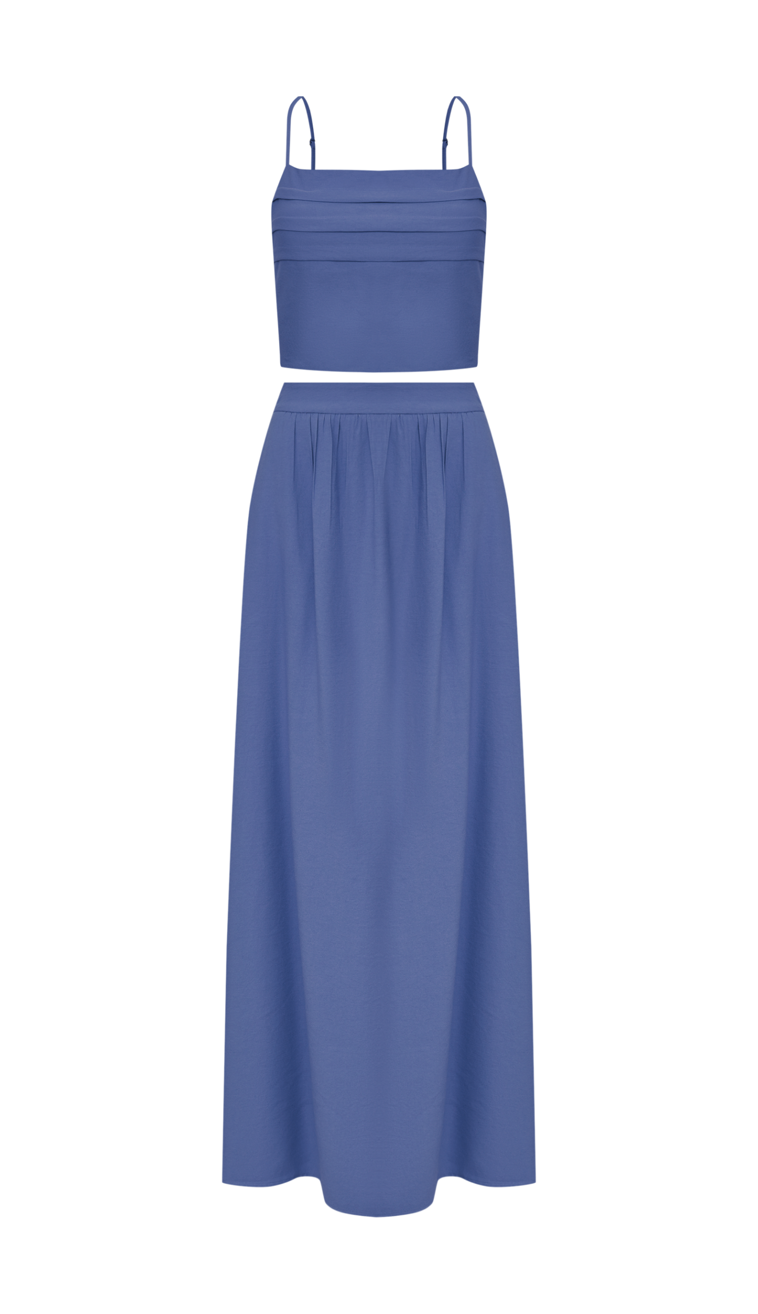 Conjunto confeccionado em sarja de alfaiataria em viscose mais encorpada. A blusa é cropped e possui modelagem ajustada, tecido duplo no busto pra não ficar transparente, alcinhas reguláveis, decote quadrado, detalhe de pregas como nervuras no decote e lastex franzido nas costas para melhor ajuste ao corpo. A saia possui forro, modelagem evasê, bolsos laterais, preguinhas no cós e fechamento traseiro por zíper de metal com pingente que tem a conchinha da Laguna gravada.