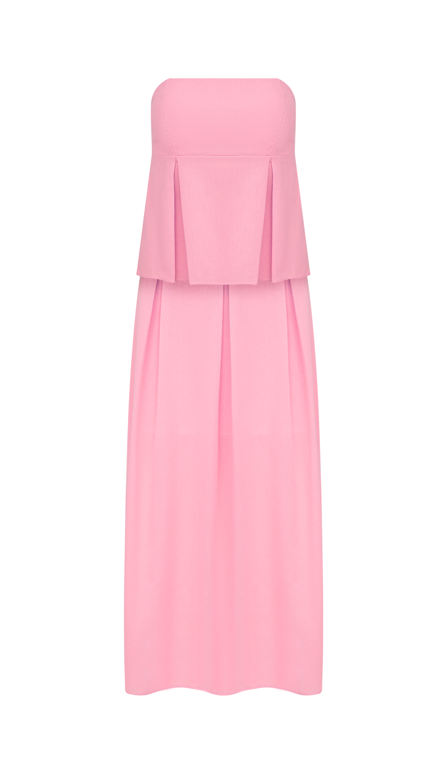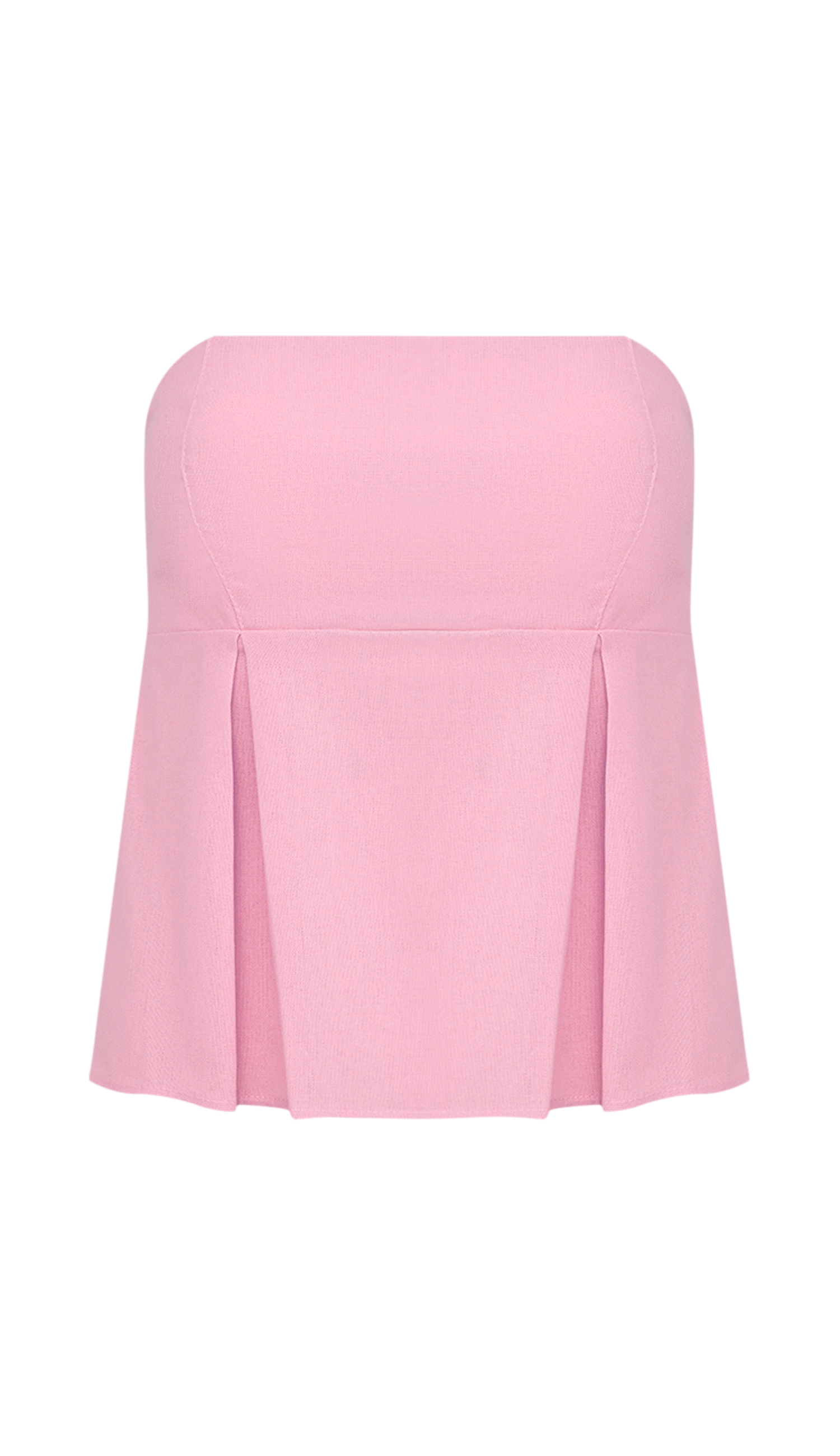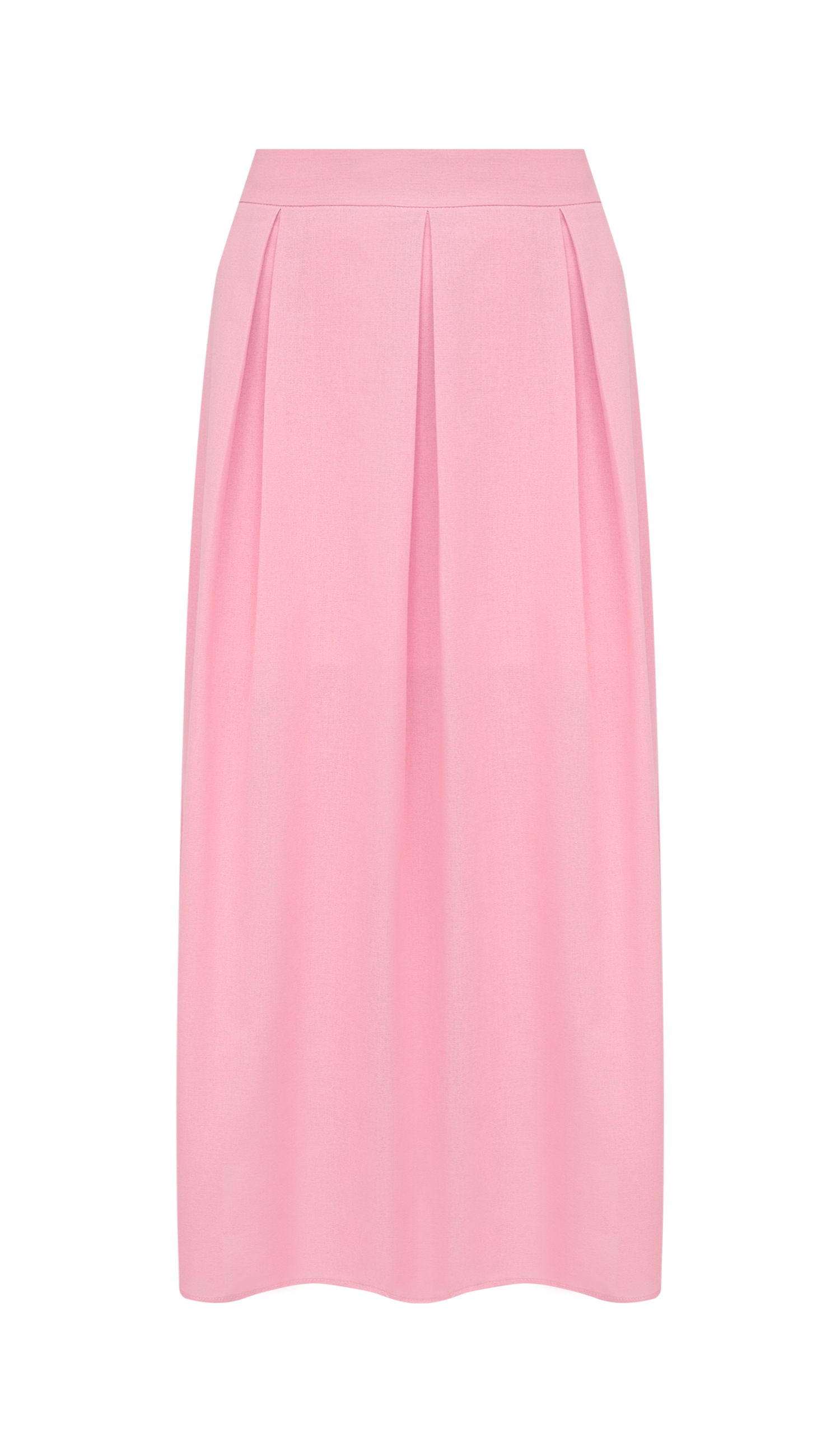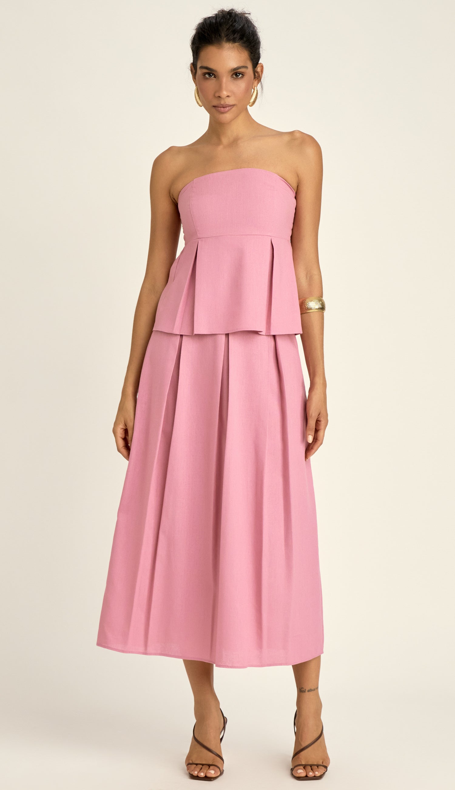 Conjunto confeccionado em linho com forro. A blusa não tem mangas, possui decote reto com silicone elástico interno, lastex franzido nas costas, modelagem império com marcação abaixo do busto e tecido soltinho logo abaixo com preguinhas que dão um sutil volume. A saia é longuete, com modelagem evasê, preguinhas que dão um lindo volume à peça e fechamento traseiro por zíper invisível.
