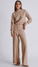 Conjunto confeccionado em malha com aspecto tweed. A blusa é cropped e possui gola alta, fechamento traseiro por botõezinhos esmaltados na nuca, barrado e mangas longas com punhos largos. A calça possui forro, modelagem reta, recortes em riscas frontais que modelam a peça, bolsos frontais com lapela dobrada e fechamento lateral por zíper de metal com pingente que tem o detalhe da conchinha da Laguna gravada.