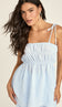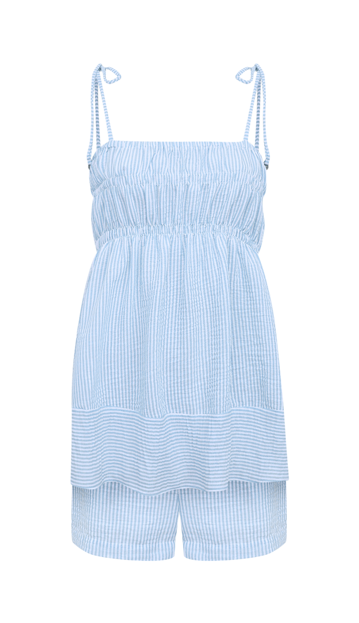 Conjunto confeccionado em gaze com textura de linho, aspecto amassadinho e padronagem listrada. A blusa estilo bata possui modelagem alongada império, decote reto, tiras elásticas embutidas em todo o busto que dão um charme franzidinho à peça, alças compridas para amarração com ponteiras de metal em formato de conchinha e recorte no barrado. O shorts possui forro, modelagem soltinha, fechamento frontal por zíper invisível e bolsos laterais. Une o conforto e a aparência sofisticada do linho com a praticidade do poliéster, que não amassa facilmente. Look versátil e estiloso que é a cara do verão.