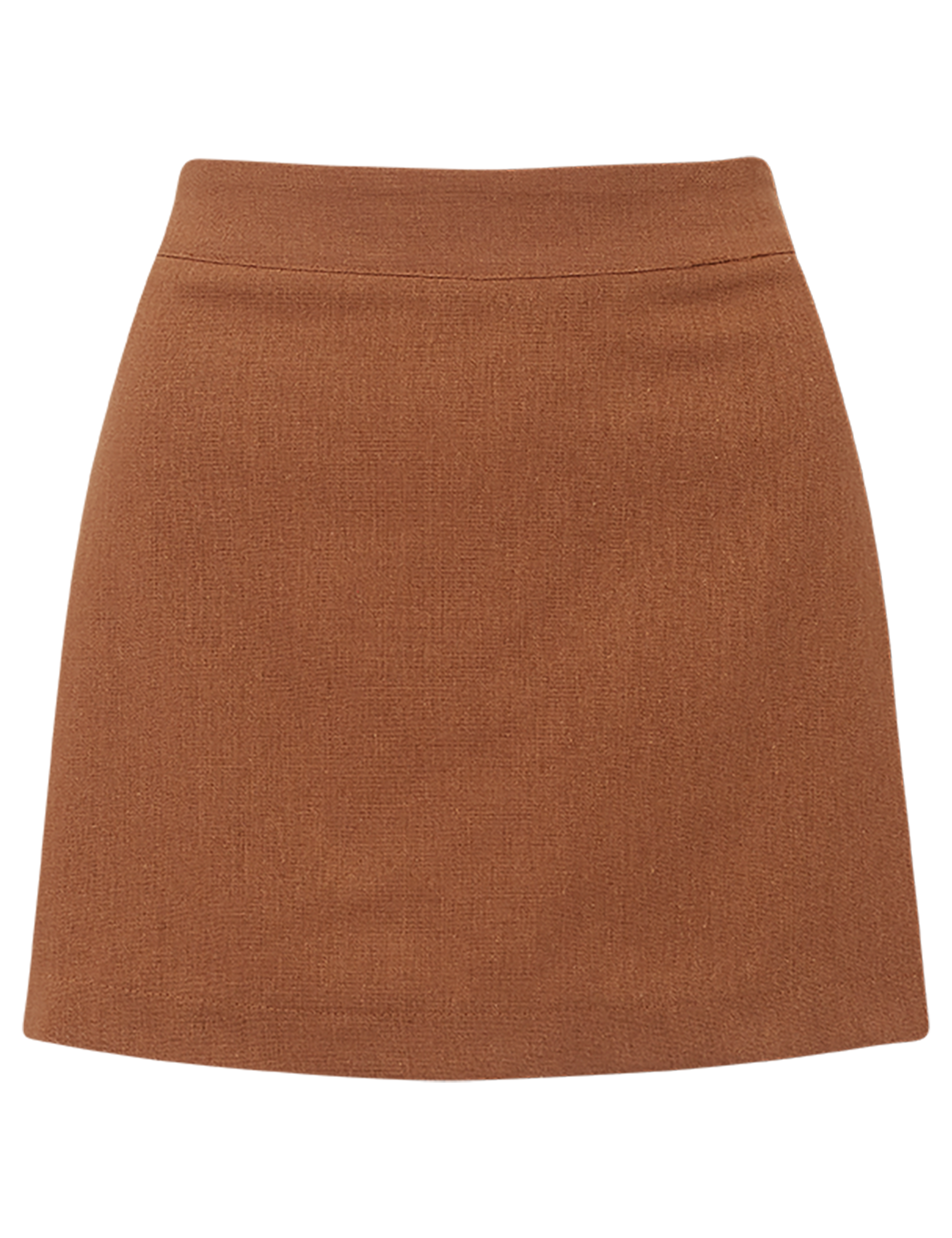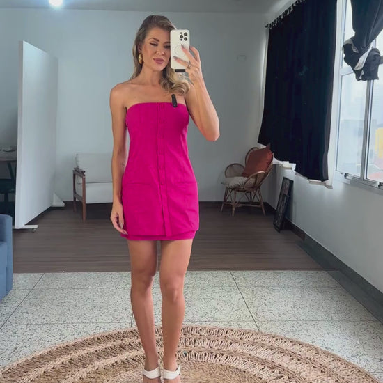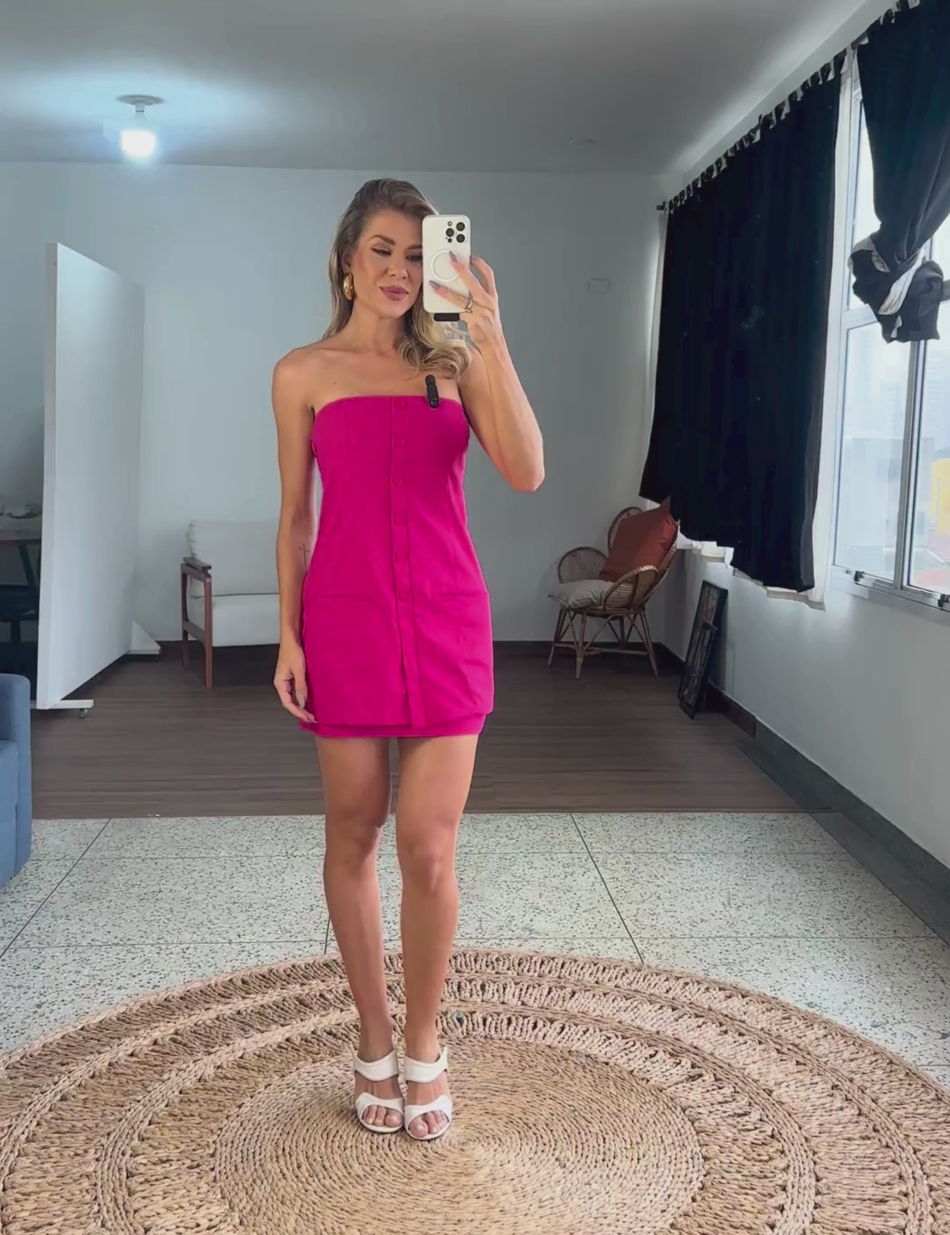 Conjunto confeccionado em linho mais encorpado com forro. A blusa não possui mangas e conta com modelagem alongada, decote reto com silicone interno para maior sustentação, recortes que modelam a peça, detalhe frontal de botões forrados de enfeite, bolsos frontais com lapela dobrada, elástico franzido nas costas e fechamento lateral por zíper invisível. A saia é curta e ajustada e possui fechamento traseiro por zíper invisível.
