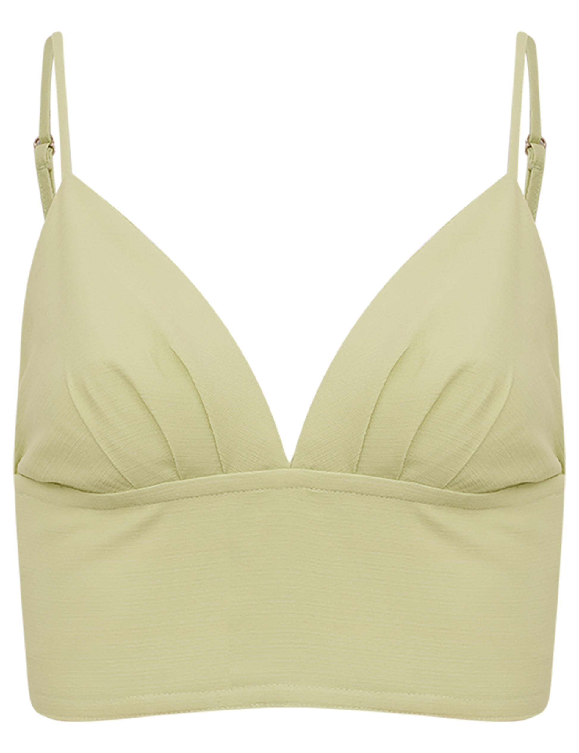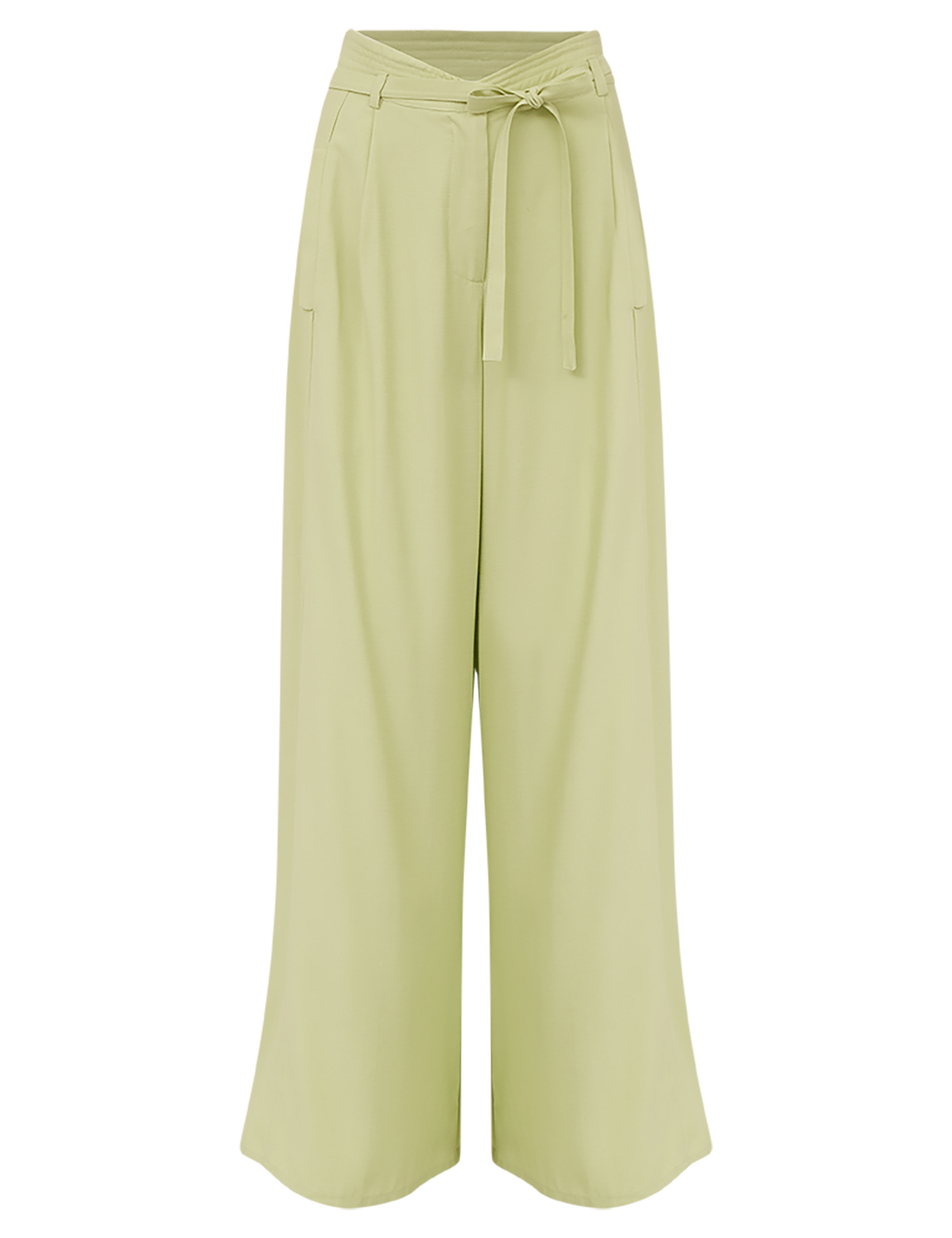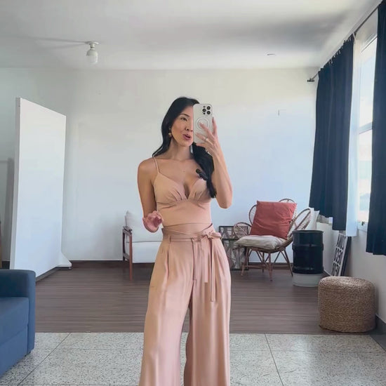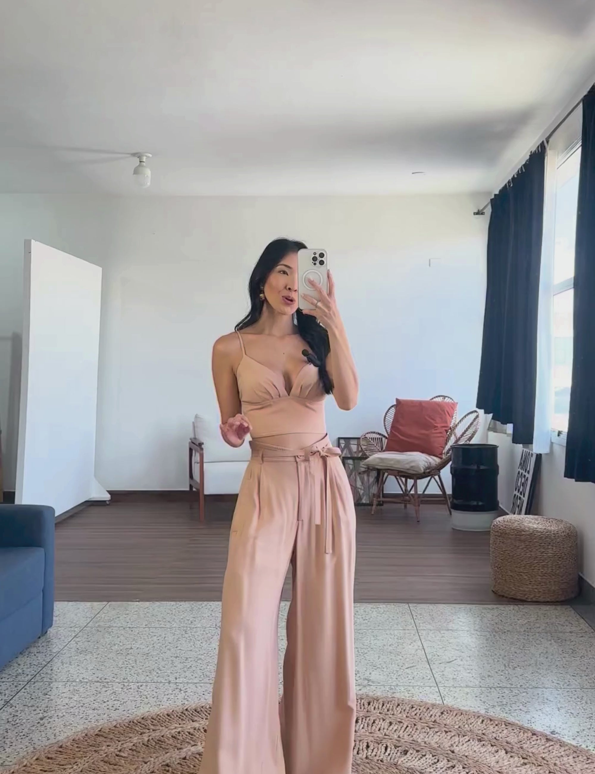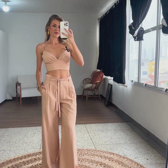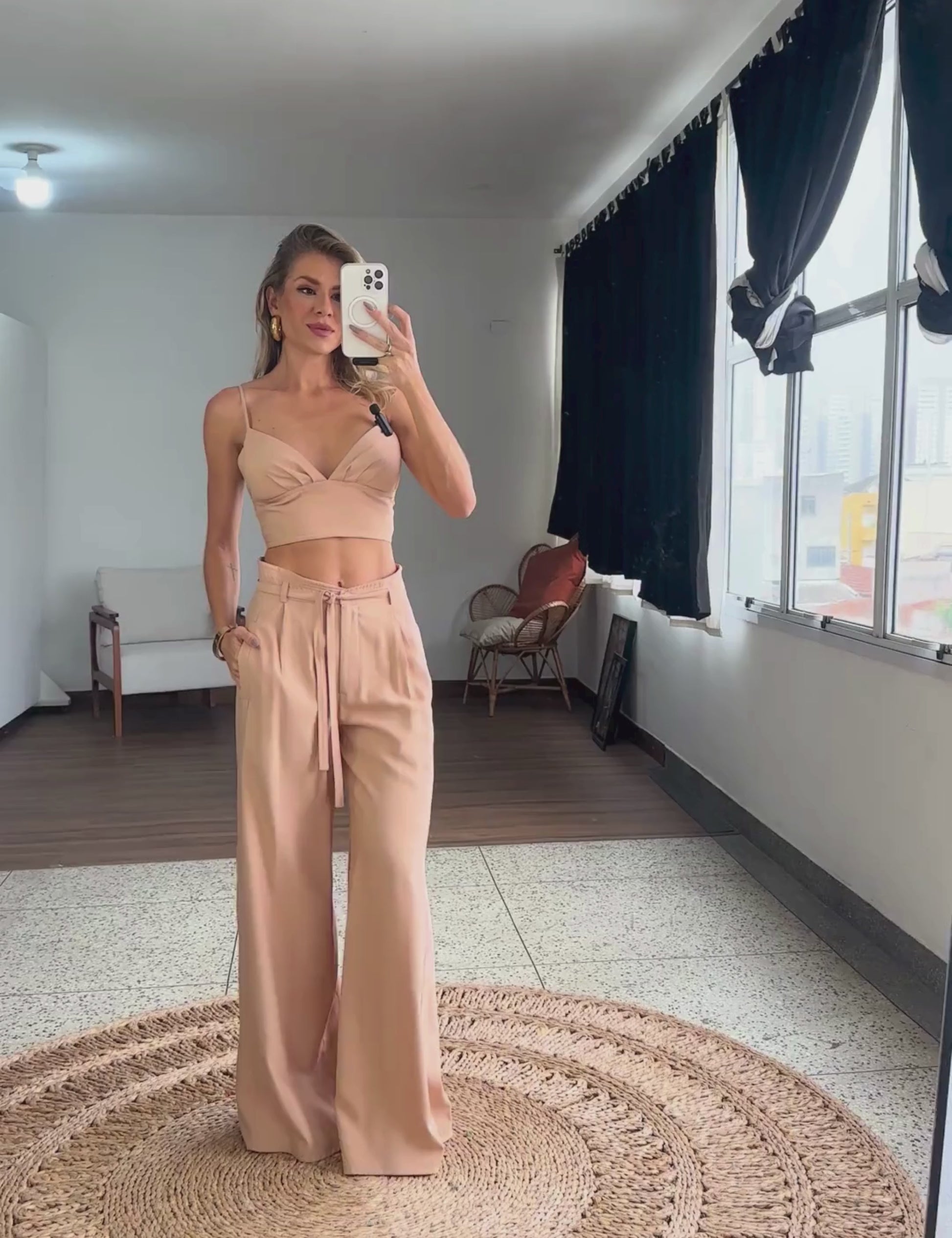 Conjunto confeccionado em poliviscose texturizada mais encorpada com aspecto de linho. O top possui decote em V com franzidinhos, tecido duplo no busto para não ficar transparente, alcinhas reguláveis, pala larga abaixo do busto e lastex franzido nas costas para melhor ajuste ao corpo. A calça possui forro, modelagem wide, cós largo pespontado com recorte geométrico frontal, passantes no cós, bolsos laterais e fechamento frontal por botãozinho forrado e zíper e acompanha faixa no mesmo tecido para amarrar.