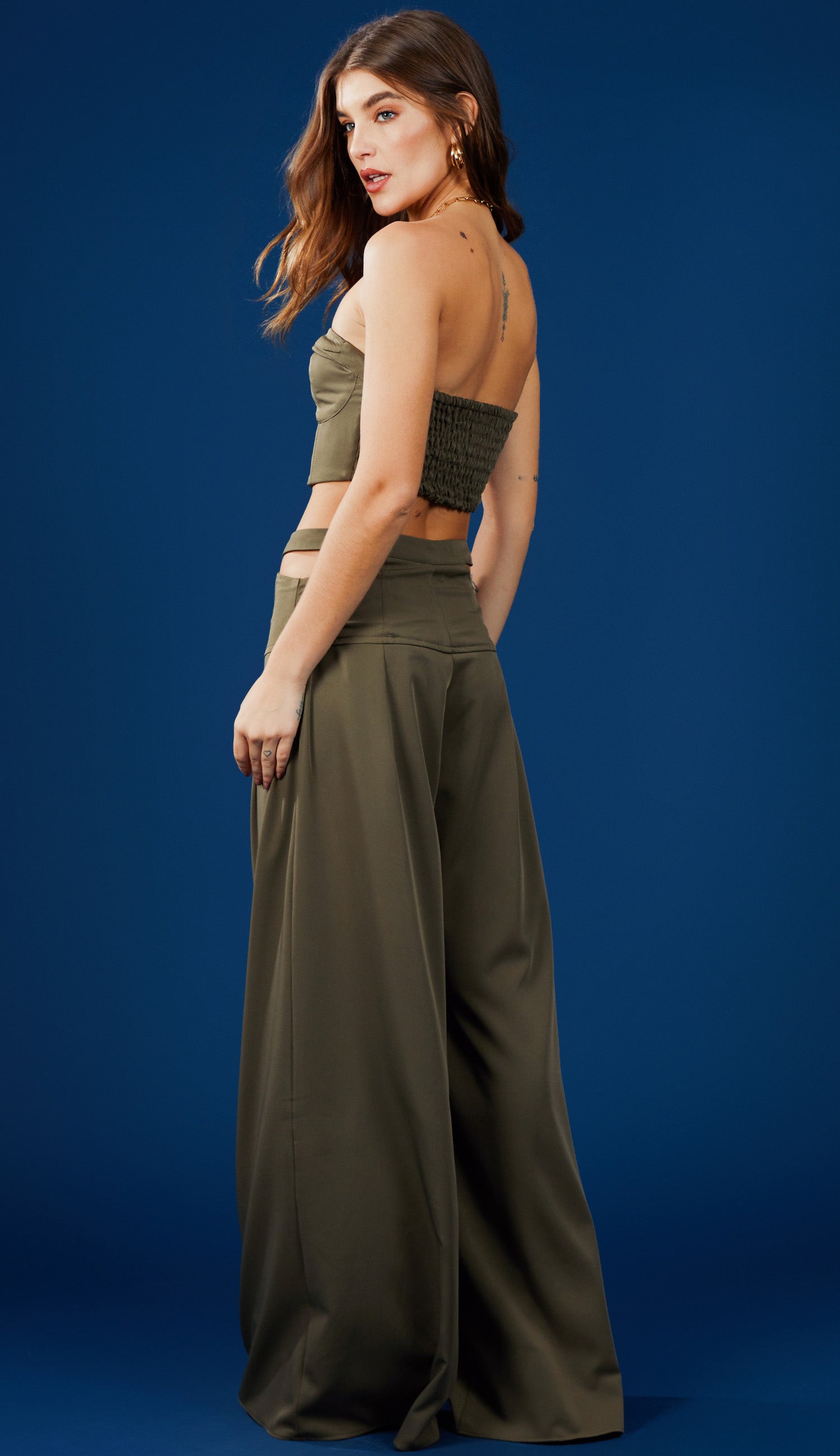 Conjunto confeccionado em crepe de alfaiataria. O top não possui mangas e conta com decote em coração com silicone interno para maior segurança; pala e recortes que modelam o busto; barbatanas para estruturar a peça e lastex franzido nas costas para maior conforto. A calça é pantalona e possui cintura alta; cós largo com pala, barbatanas e recorte lateral vazado; fechamento frontal por zíper invisível e pregas frontais.