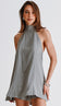 Conjunto confeccionado em crepe texturizado com efeito amassadinho. O vestido curto é frente única, possui decote halter com detalhe de nervuras na gola, costas nuas, modelagem ampla com nesgas, fechamento traseiro na gola por botões esmaltados e nas costas por zíper invisível e detalhe de preguinhas nas costas também. O shorts é curto e soltinho, com fechamento lateral por zíper invisível.