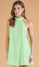 Conjunto confeccionado em crepe texturizado com efeito amassadinho. O vestido curto é frente única, possui decote halter com detalhe de nervuras na gola, costas nuas, modelagem ampla com nesgas, fechamento traseiro na gola por botões esmaltados e nas costas por zíper invisível e detalhe de preguinhas nas costas também. O shorts é curto e soltinho, com fechamento lateral por zíper invisível.