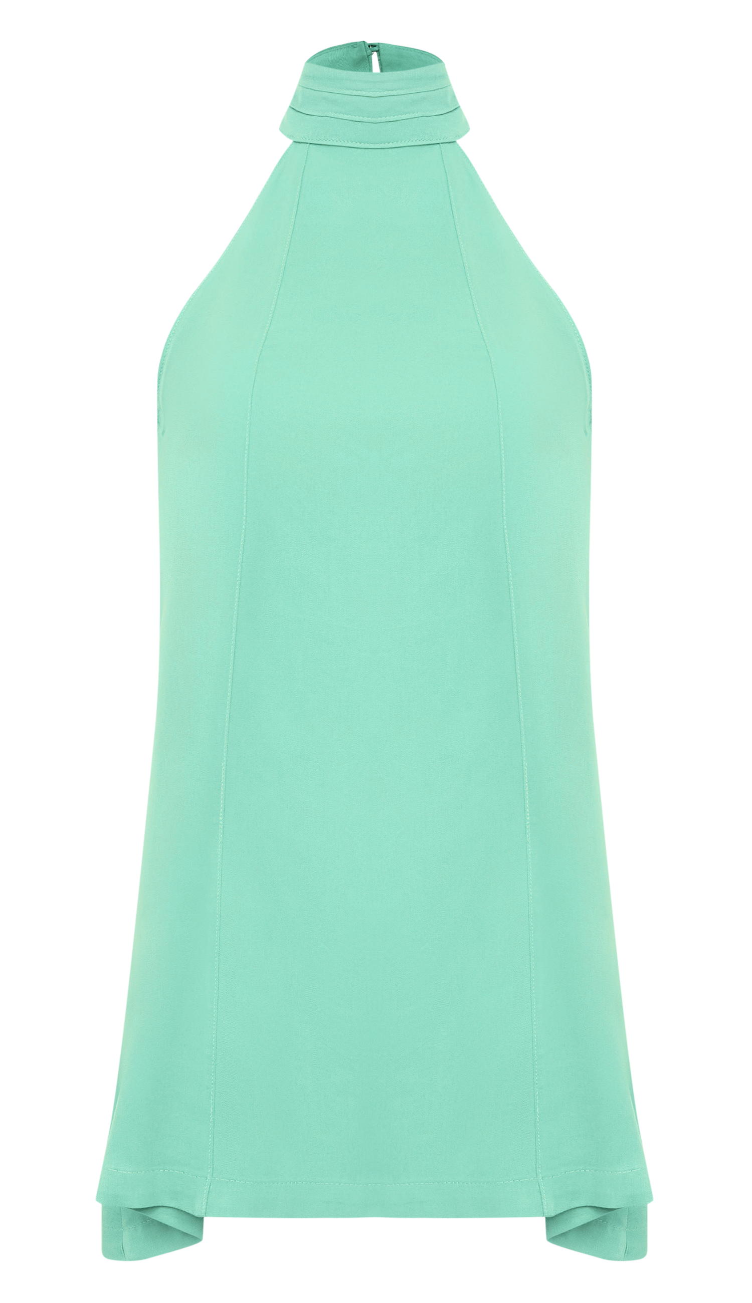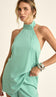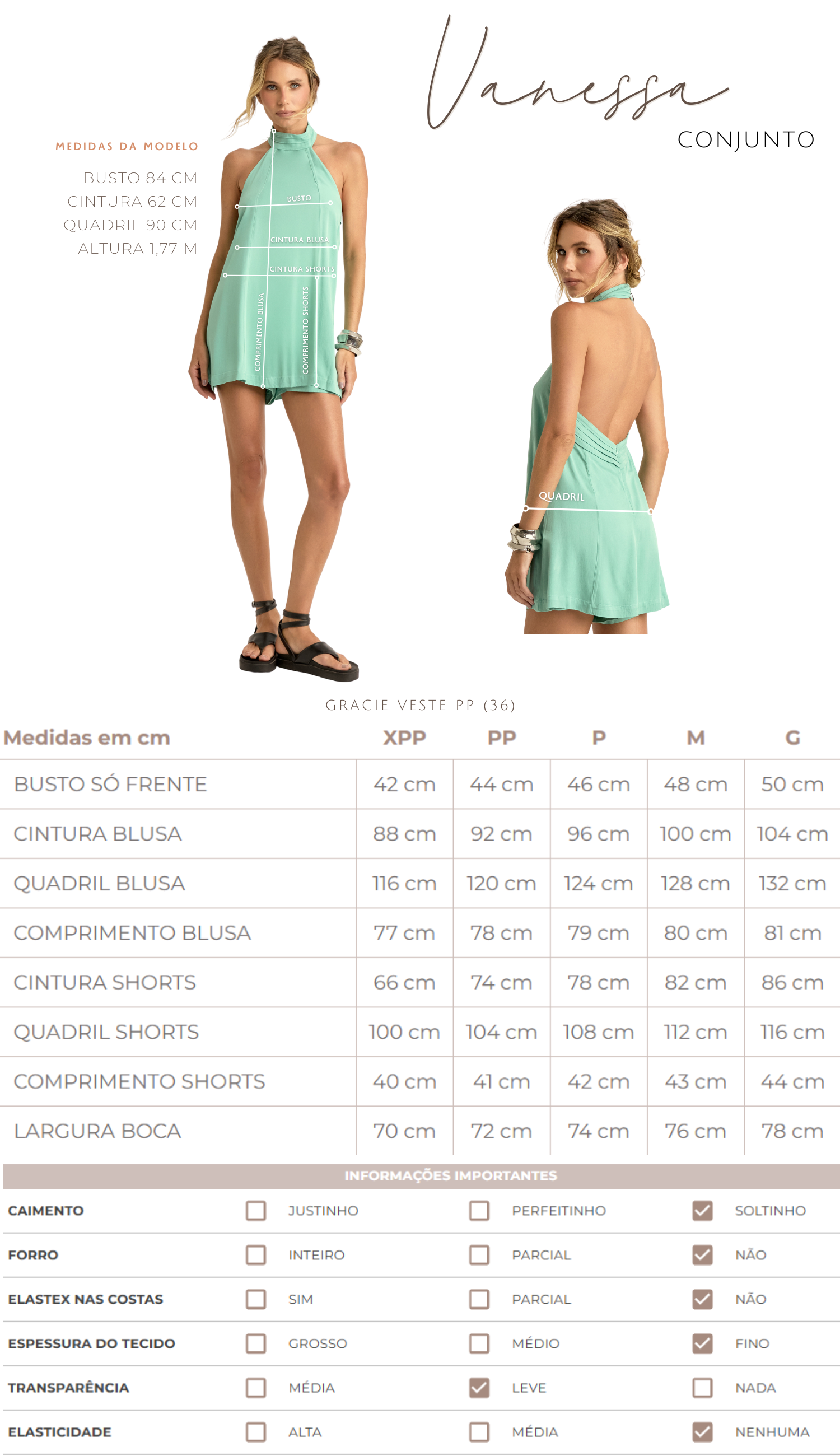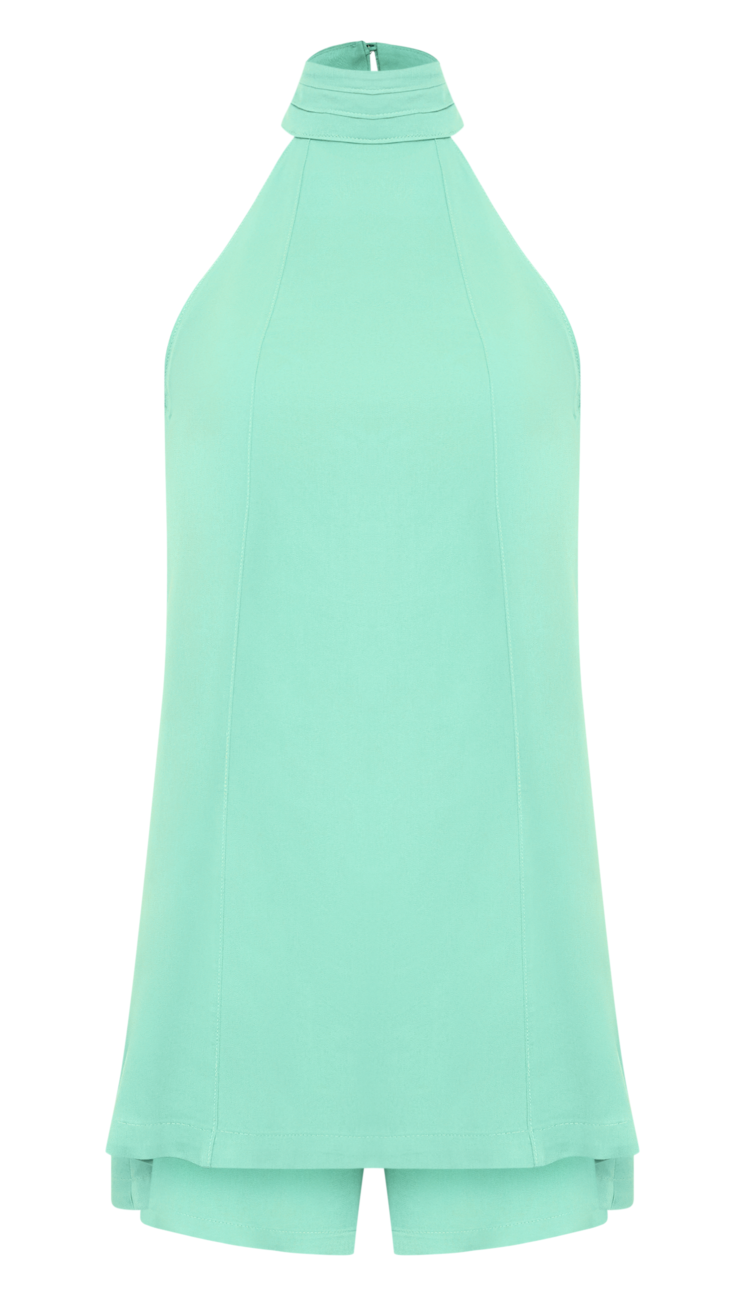 Conjunto confeccionado em viscose twill. O vestido é curto e frente única, possui decote halter com detalhe de nervuras na gola, costas nuas, modelagem ampla com recortes, fechamento traseiro na gola por botões esmaltados e nas costas por zíper invisível e detalhe de preguinhas na pala das costas também. O shorts é curto e soltinho, com fechamento lateral por zíper invisível.