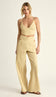 Conjunto confeccionado em linho com forro. O top possui alcinhas reguláveis, lastex franzido nas costas para melhor ajuste ao corpo, decote em V com recortes e franzidinhos que modelam o busto, seguido de pala logo abaixo com barbatanas que estruturam a peça e bico no centro do decote e da barra que desenham a silhueta. A calça é no estilo wide e possui bolsos laterais, cós largo com detalhe frontal franzidinho que cria um lindo recorte na peça, vazados laterais no limite do cós e fechamento traseiro por zíper de metal com pingente que tem a conchinha da Laguna gravada.