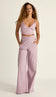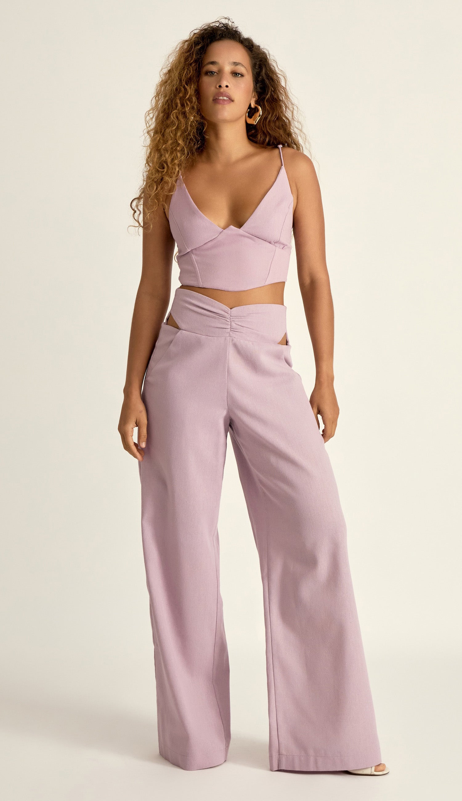 Conjunto confeccionado em linho com forro. O top possui alcinhas reguláveis, lastex franzido nas costas para melhor ajuste ao corpo, decote em V com recortes e franzidinhos que modelam o busto, seguido de pala logo abaixo com barbatanas que estruturam a peça e bico no centro do decote e da barra que desenham a silhueta. A calça é no estilo wide e possui bolsos laterais, cós largo com detalhe frontal franzidinho que cria um lindo recorte na peça, vazados laterais no limite do cós e fechamento traseiro por zíper de metal com pingente que tem a conchinha da Laguna gravada.