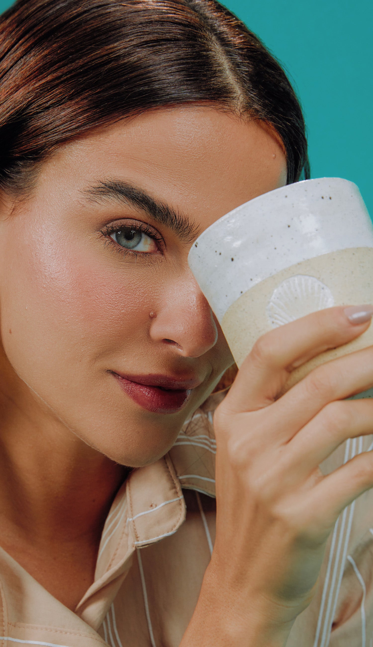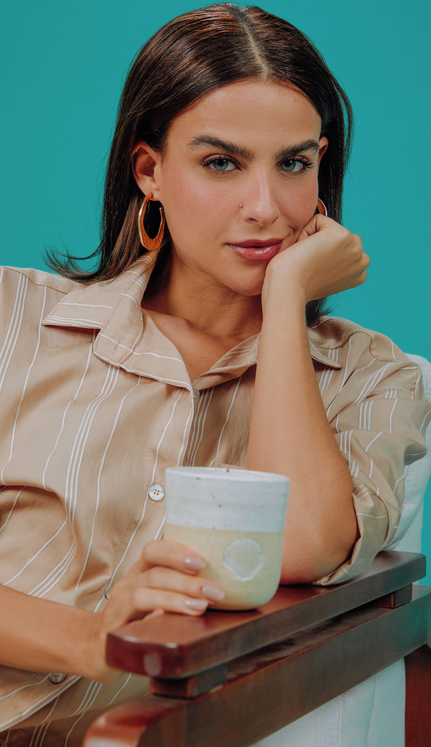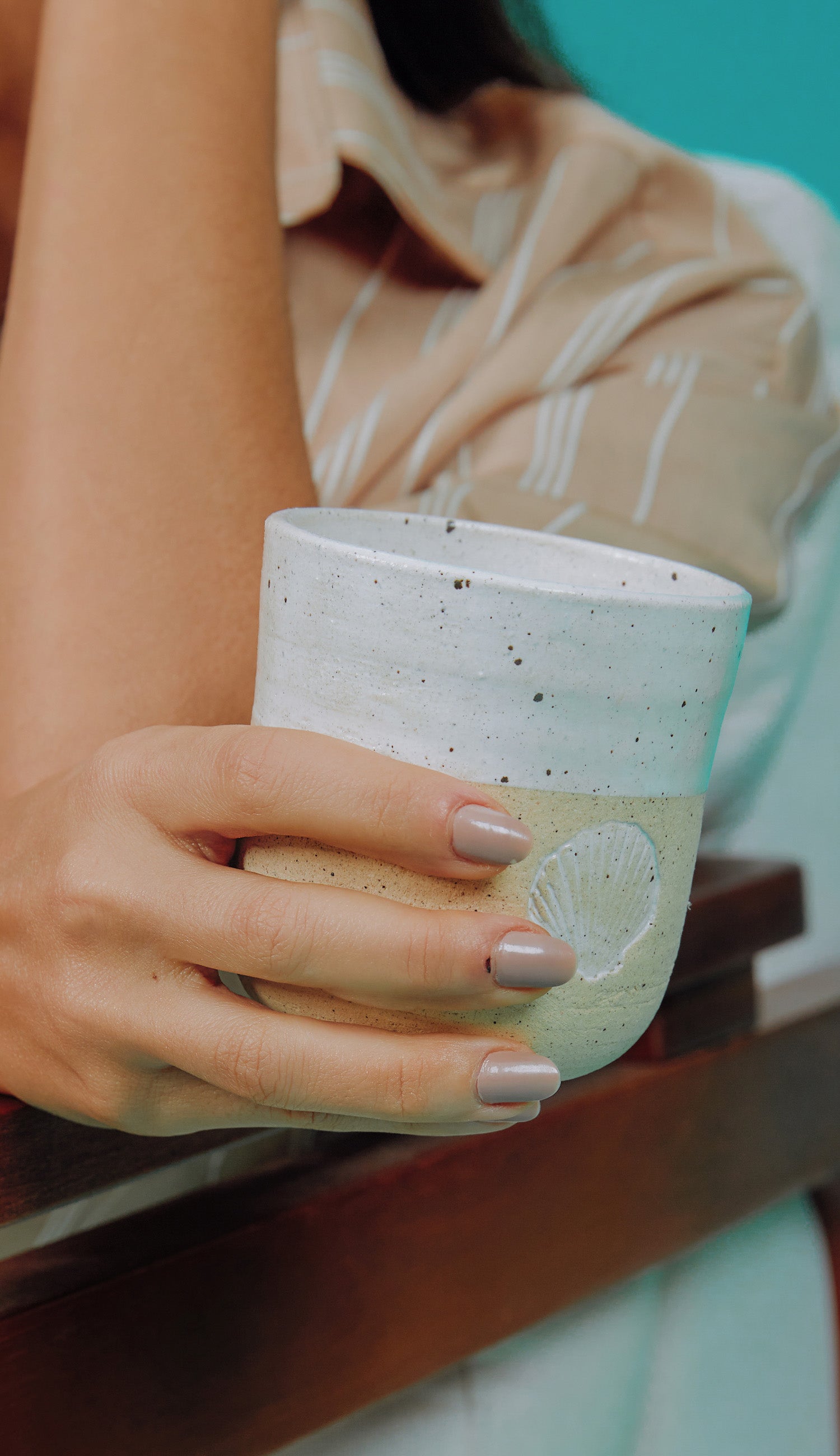 Copo de cerâmica com detalhes pintados à mão e relevo gravado com o formato da concha da Laguna. Além de funcional, ainda é um belíssimo artigo de decoração.