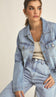Jaqueta cropped confeccionada em jeans com lavagem média. Possui mangas longas. Barra desfiada. Bolsos frontais e fechamento por botões em níquel. É a peça perfeita para combinar com seus looks Laguna em dias mais friozinhos!