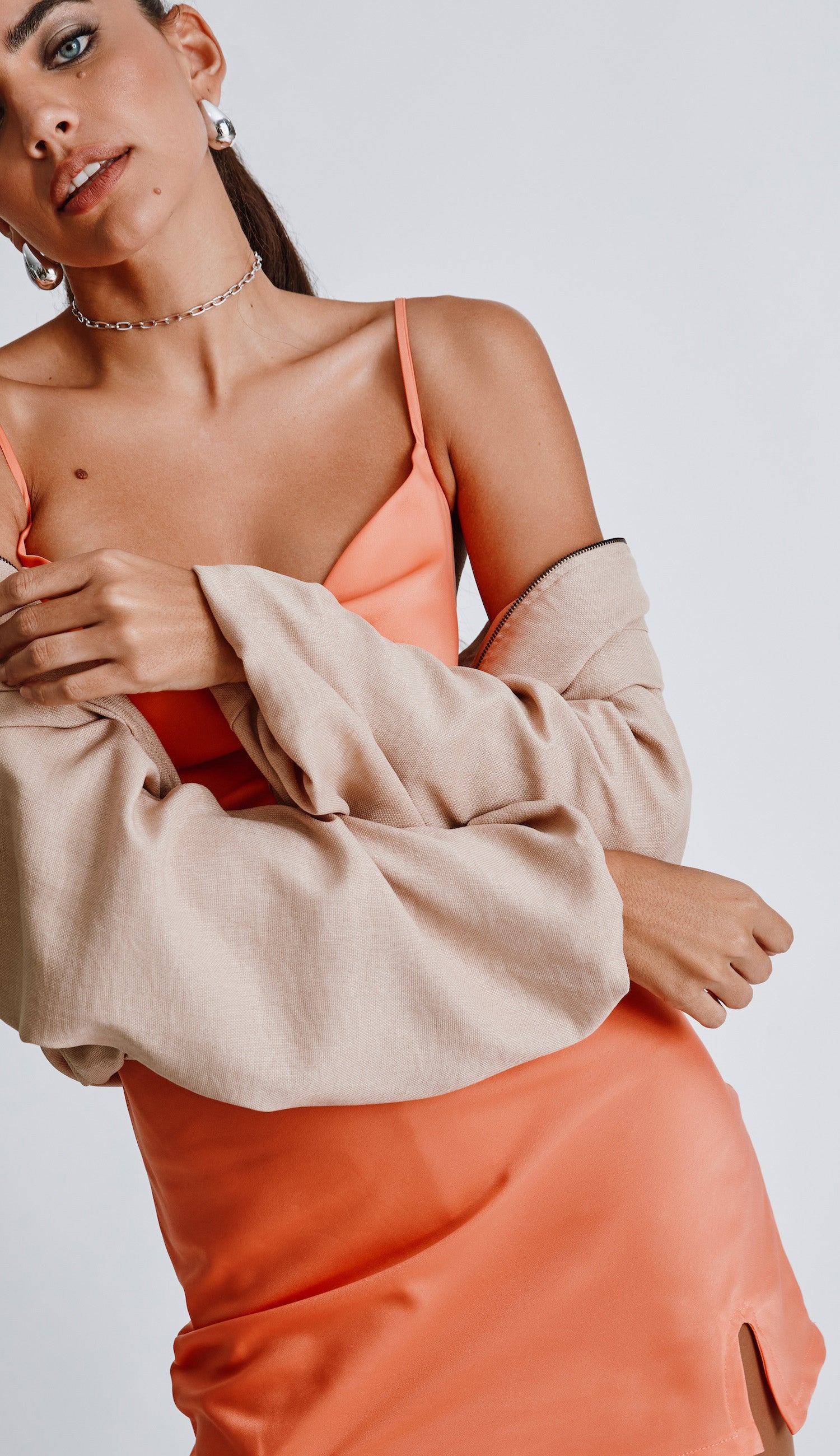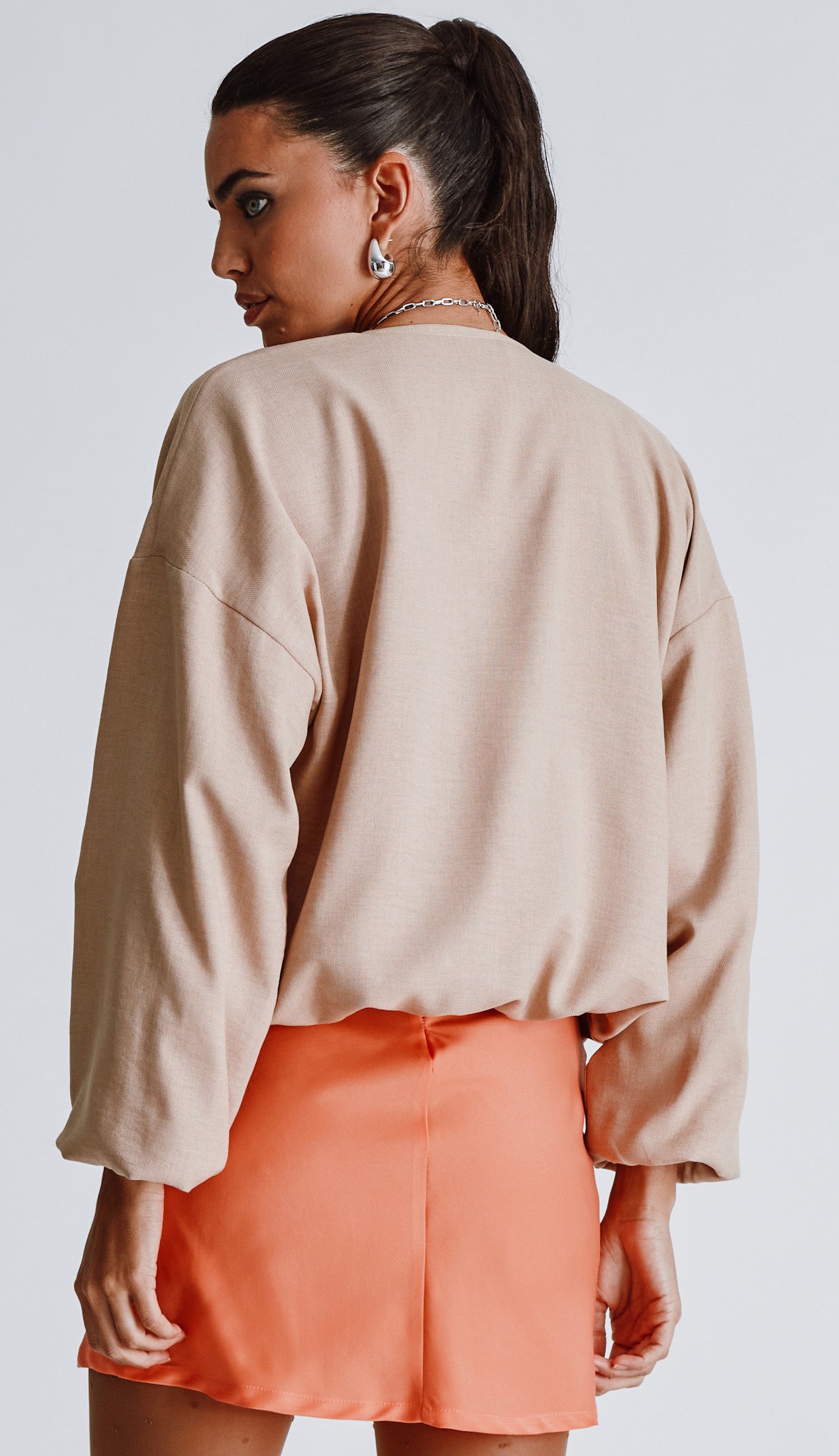 Jaqueta com forro, confeccionada em poliéster maquinetado com aspecto de linho e efeito amassadinho. Possui gola redonda, fechamento frontal por zíper de metal com pingente que tem o delicado detalhe da conchinha da Laguna gravada, bolsos laterais e elástico franzido interno nos punhos e na barra, dando um efeito levemente blusê.